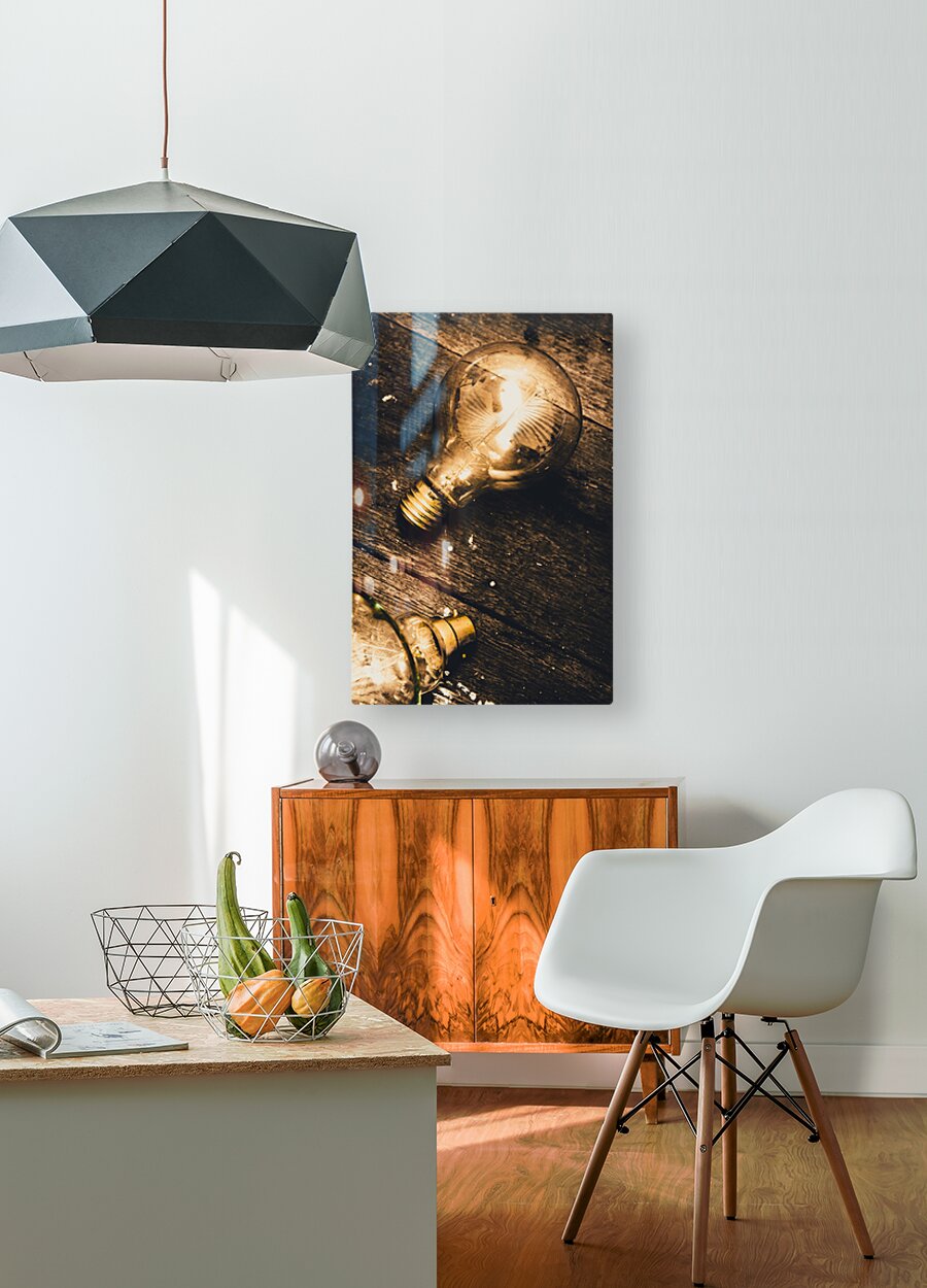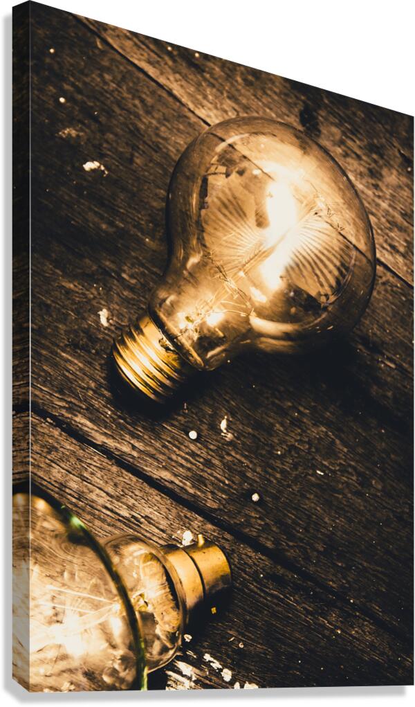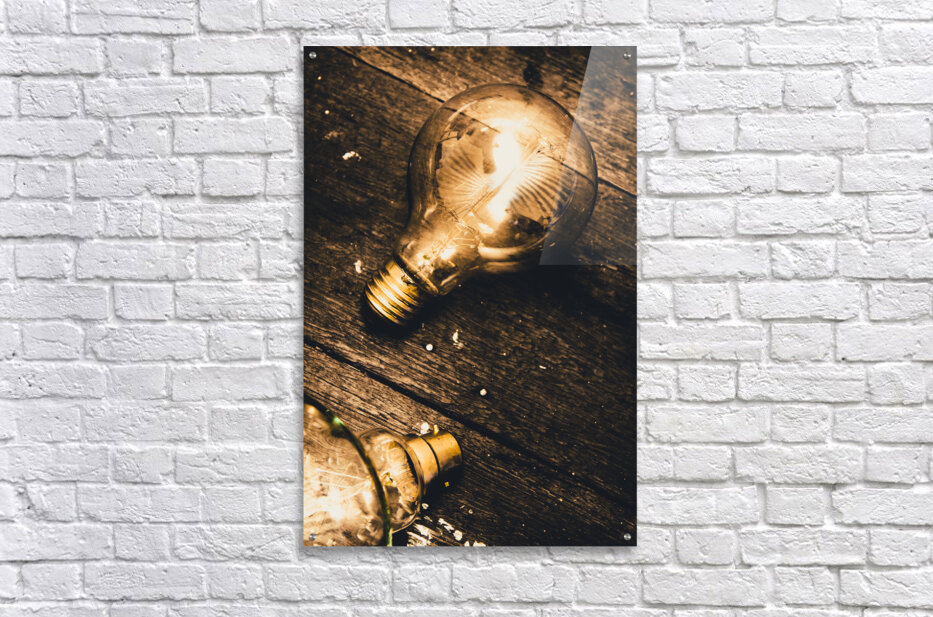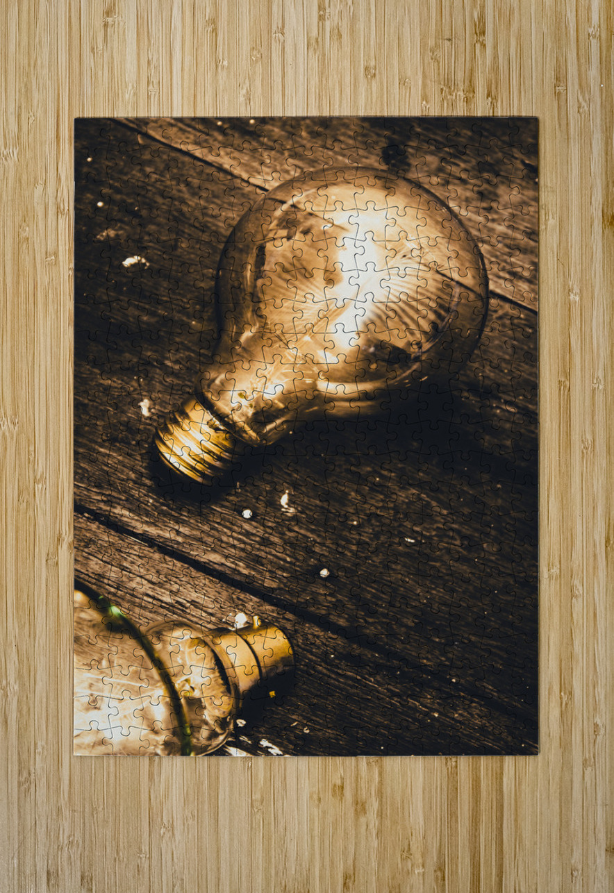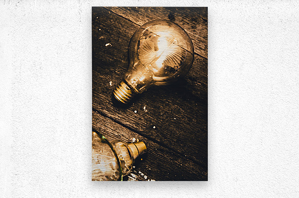 Still-life conceptual objects on a detached glowing lightbulb magically shining on old grunge wood floor. Illuminating inspiration