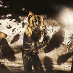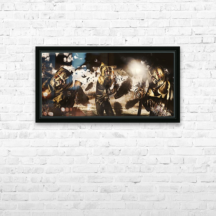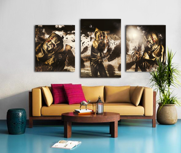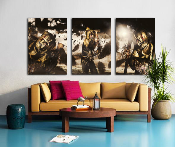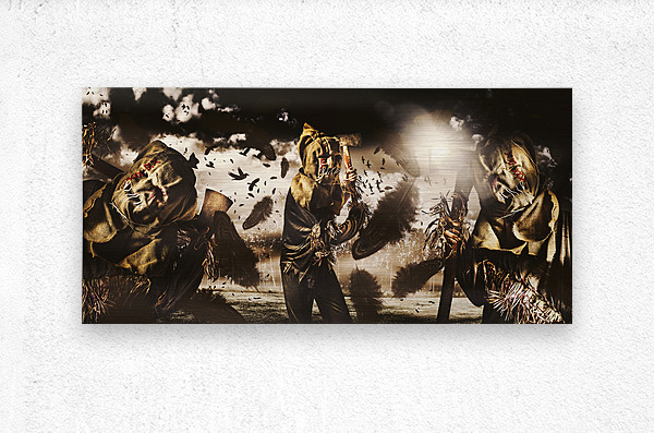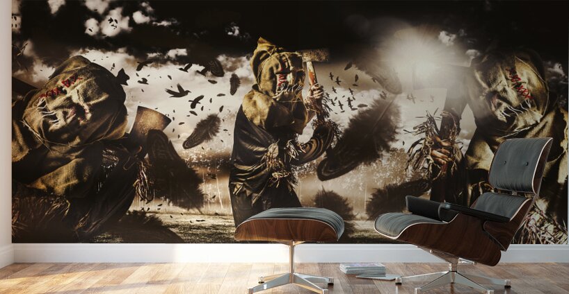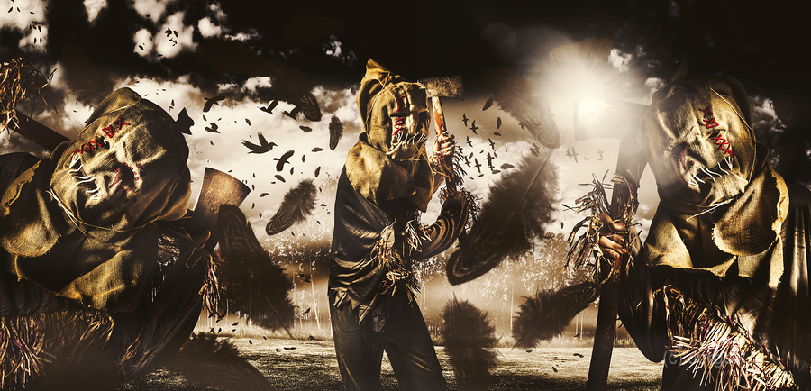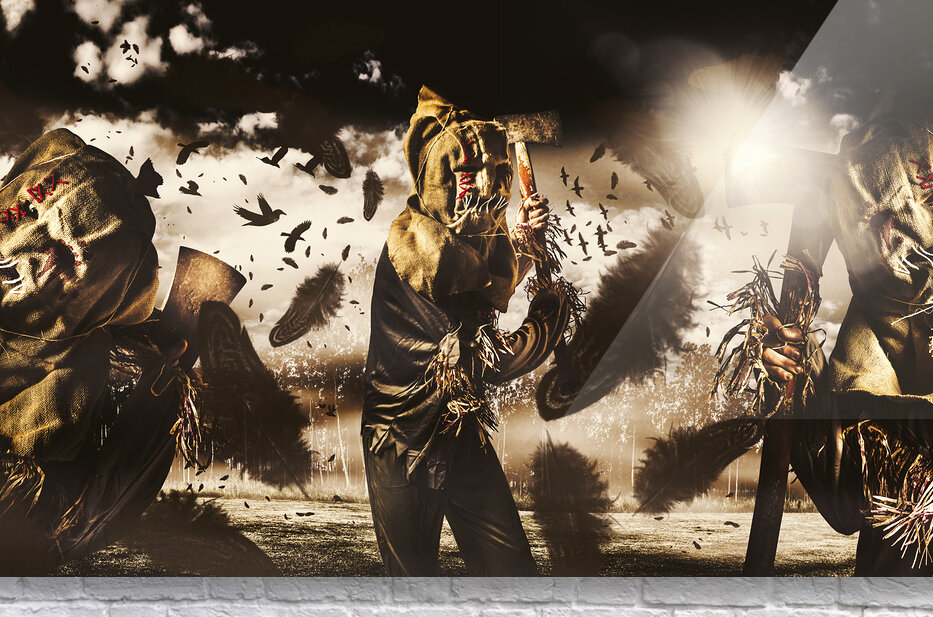 Dark dramatic horror portrait of 3 killer scarecrows taking a murderous stance with axes under a debris of falling feathers. A crow left of the murder