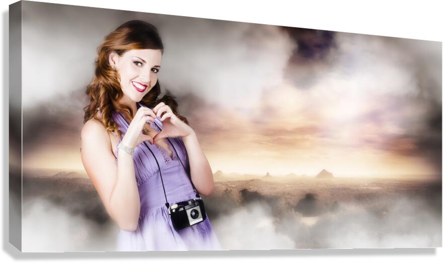 Lovely Female Photographer With Retro Camera Showing Heart Gesture When Taking Travel Photographs Of A Misty Mountain Landscape In A Photography Love ...[+]