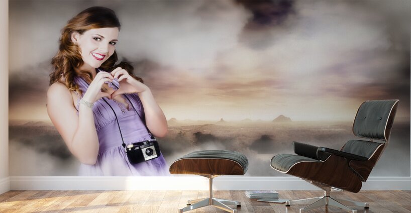 Lovely Female Photographer With Retro Camera Showing Heart Gesture When Taking Travel Photographs Of A Misty Mountain Landscape In A Photography Love Concept