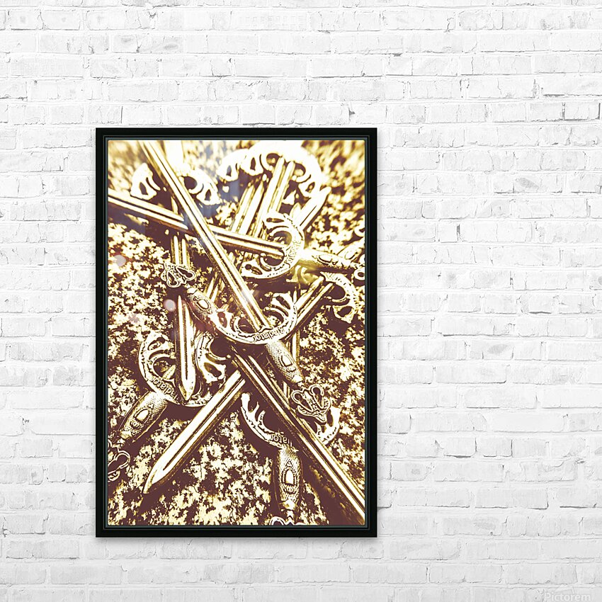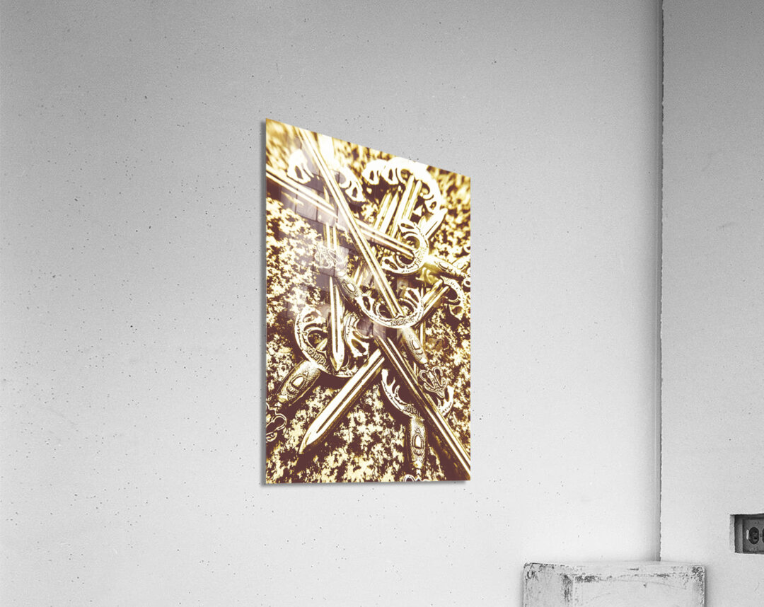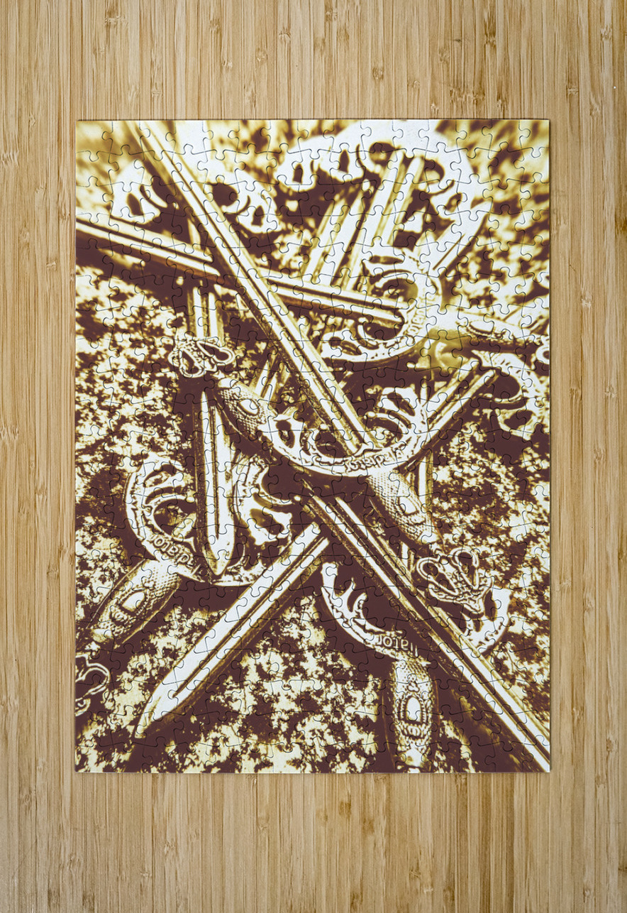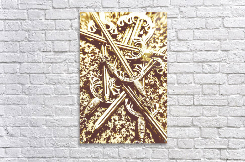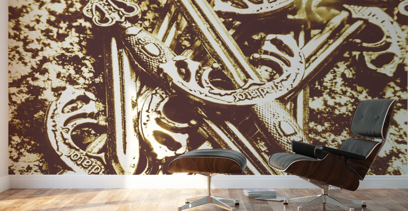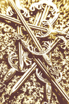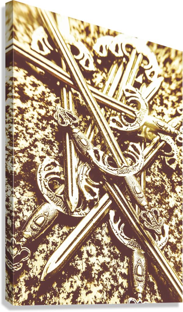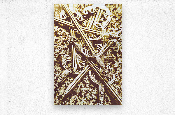 Vintage toned still-life art on a stockpile of blacksmith forged medieval weaponry in shiny abstract