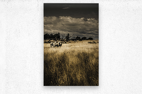 Vertical picture of Tasmanian countryside in Australia including farm animals in dry grass paddock. Taken outskirts of Hobart