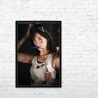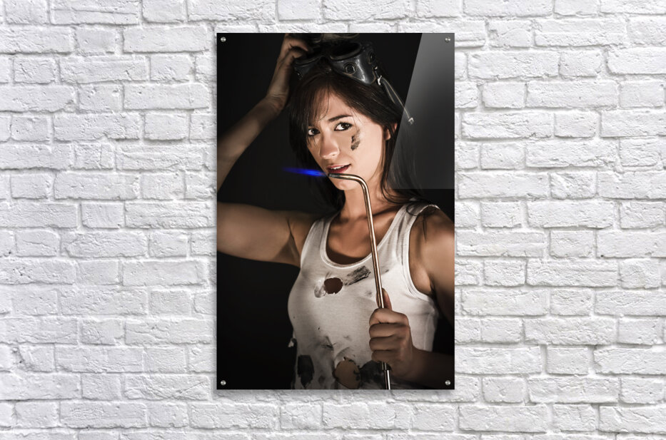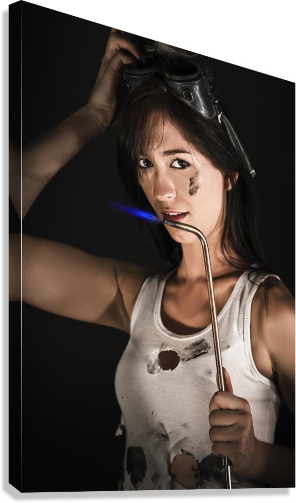 Dark portrait of a sexy young brunette woman in an oil-stained top and goggles holding a burning blow torch in a panel beater concept