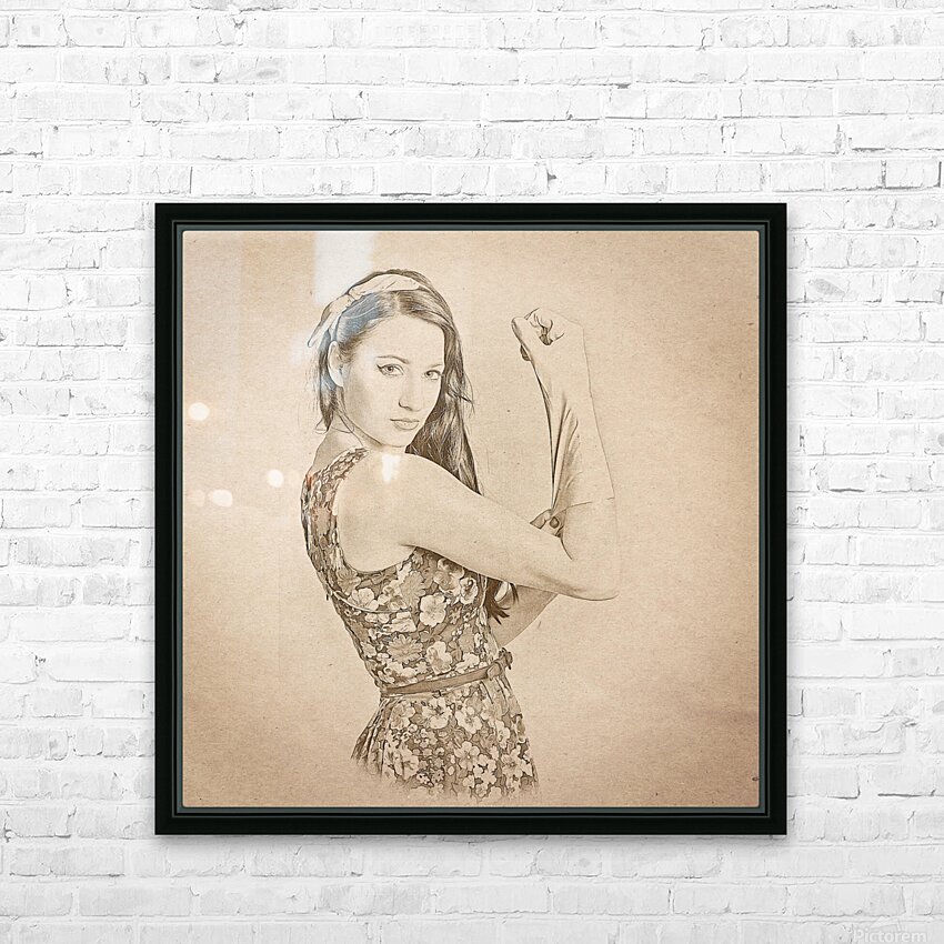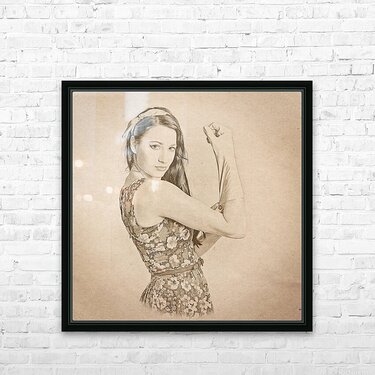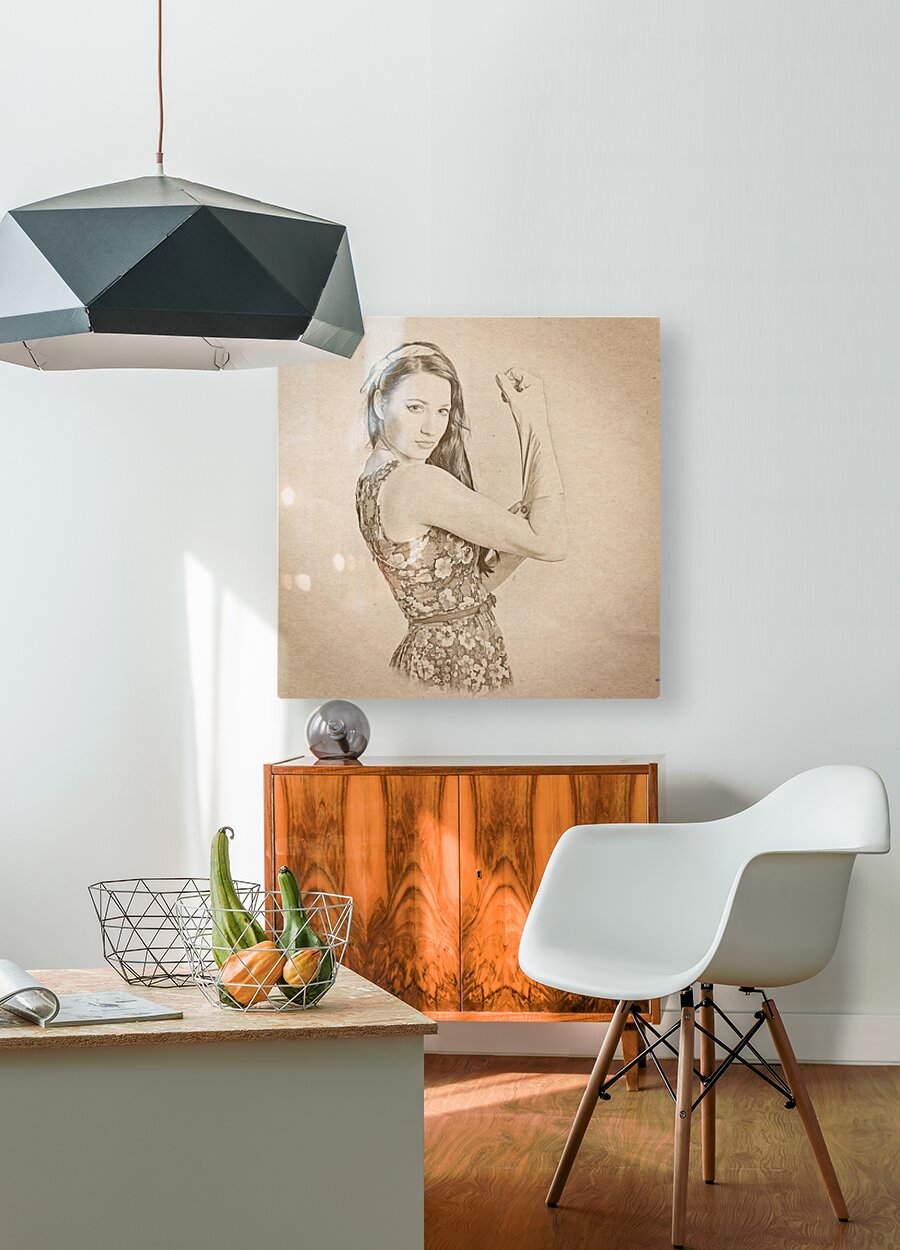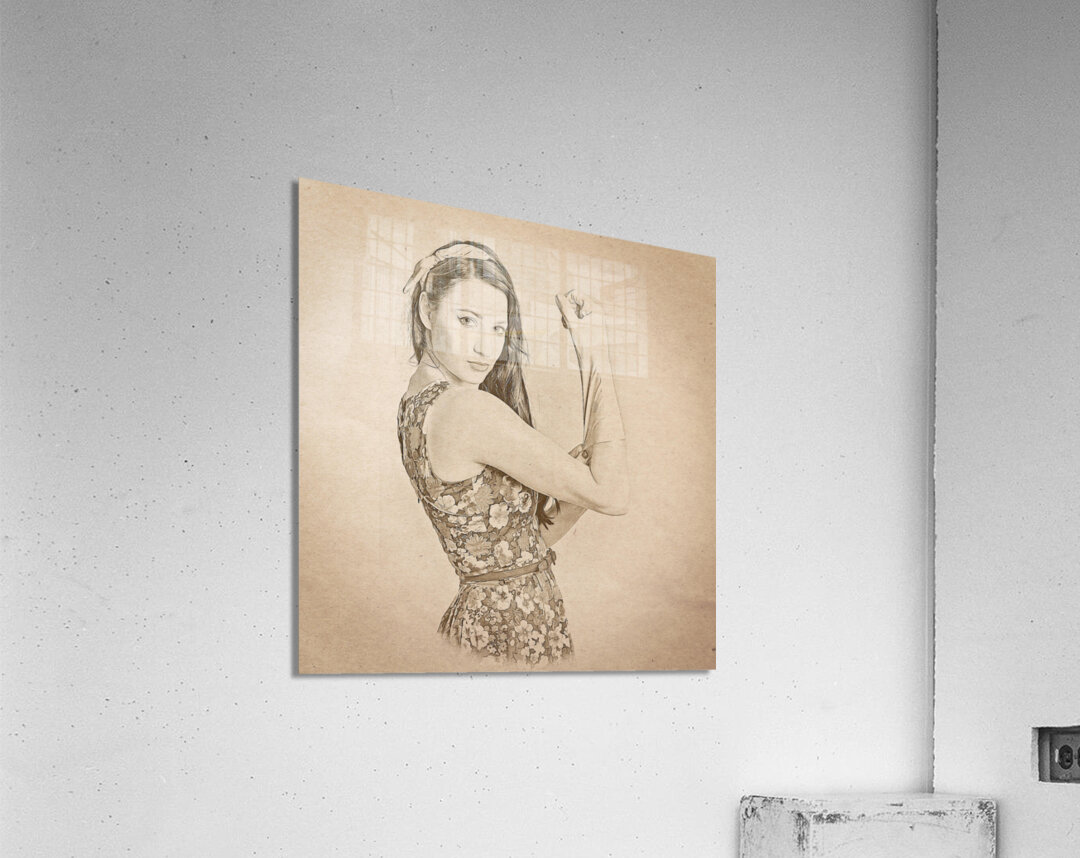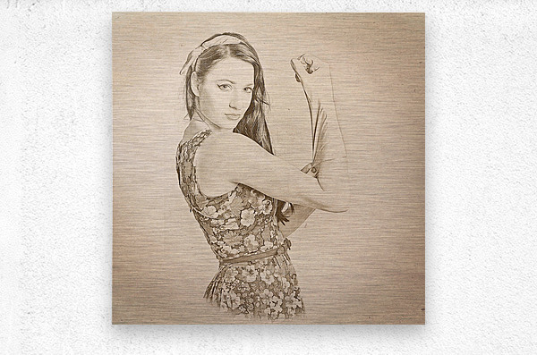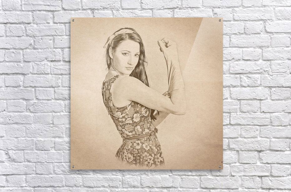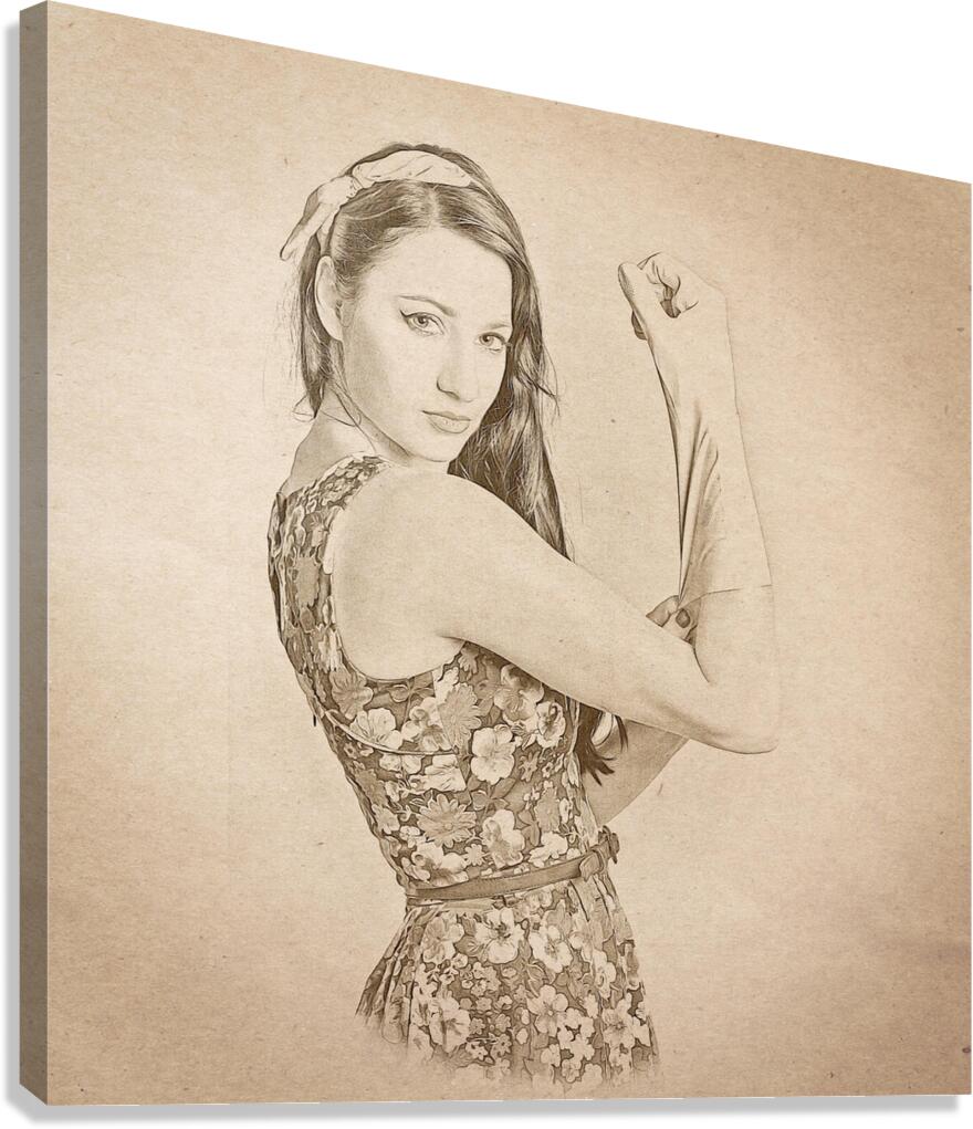 Fine art black and white drawing of a beautiful young pin-up woman looking at camera and showing biceps muscles. Strong 1950s housewives