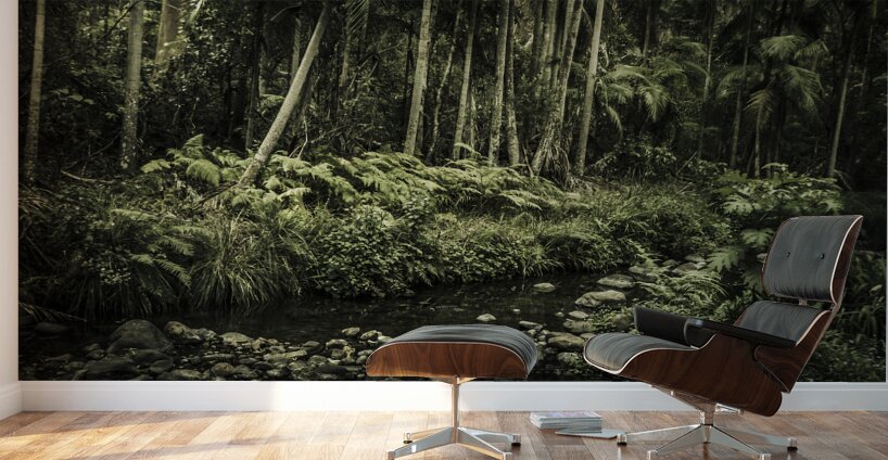 Dark nature tranquility on a rainforest landscape panorama with creek and ferns. Mt Tamborine Queensland Australia