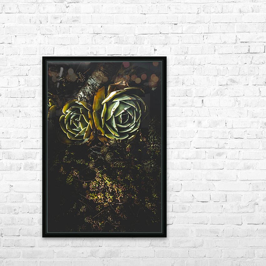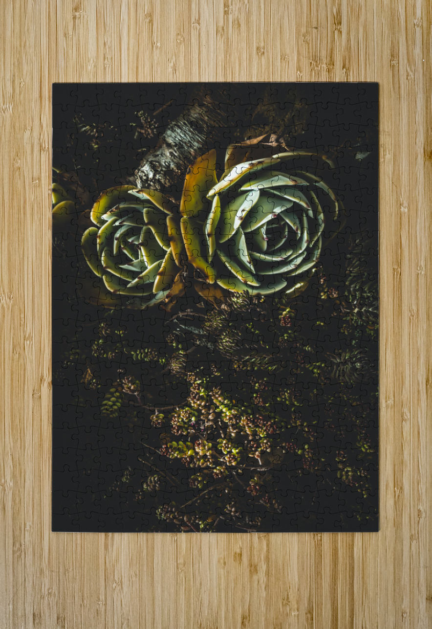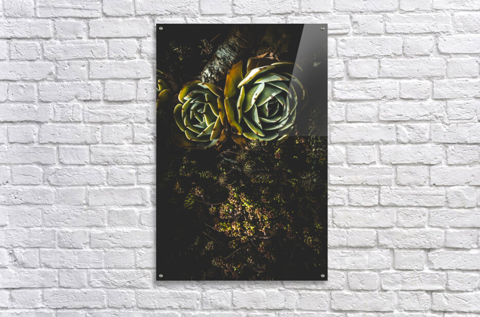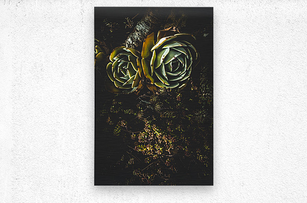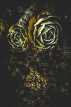 Vertical darkness capture on two succulent plants also known as succulents or sometimes fat plants from their water retention qualities in arid climates. Desert flowers
