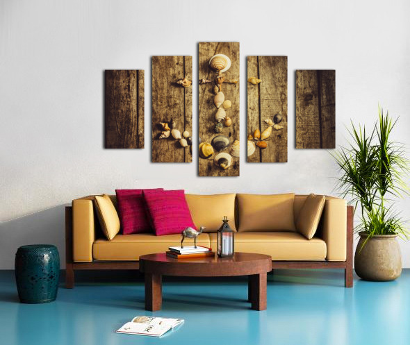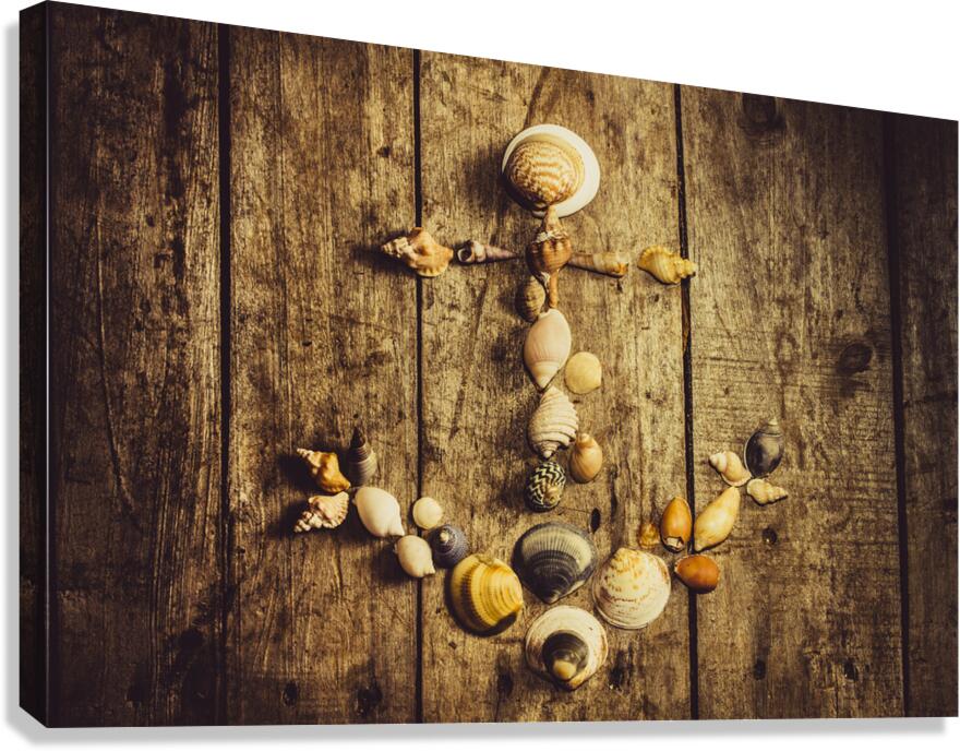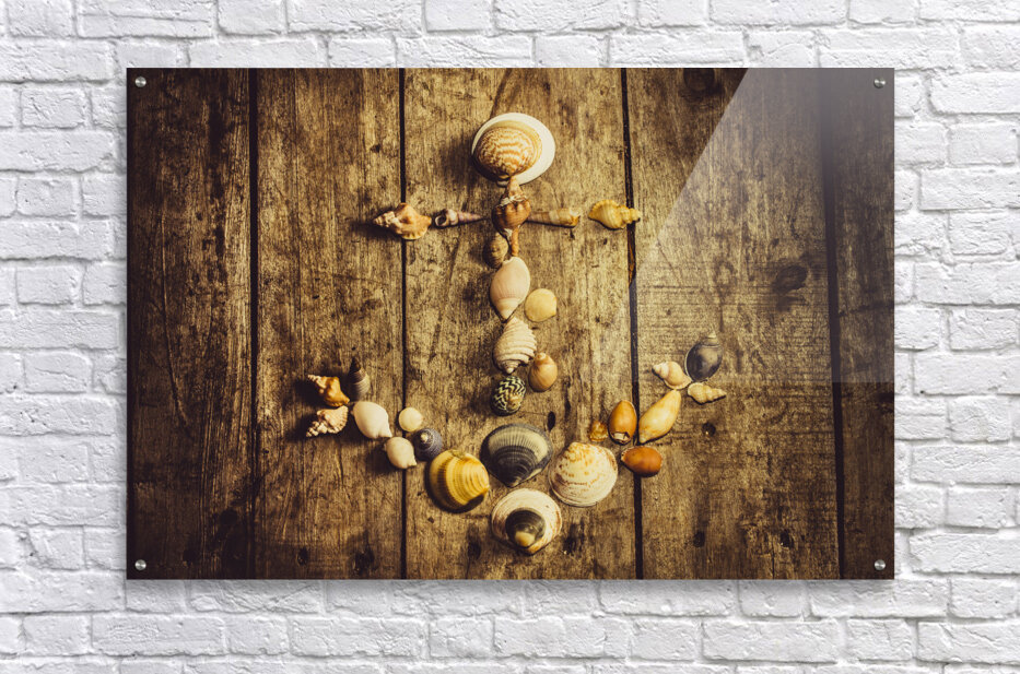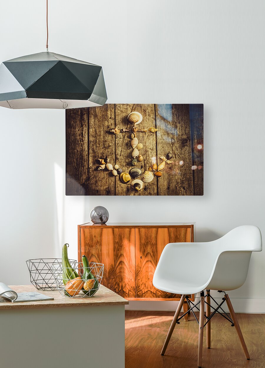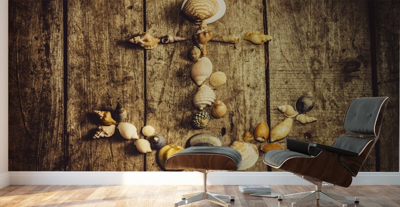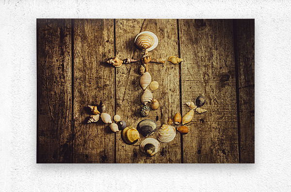 Rustic decorative seaside art on a maritime anchor made with various sized ocean shells on wooden planks background. Nautical beach house details