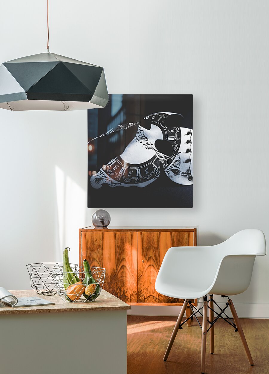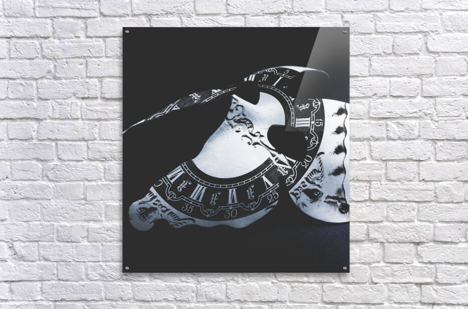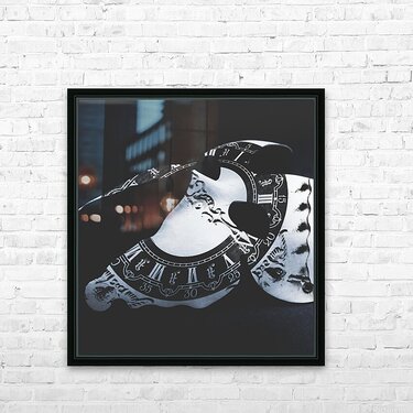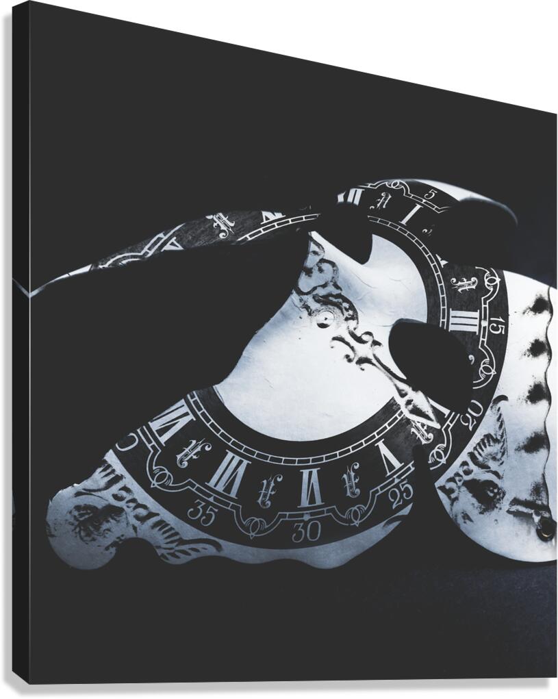 A clock face in performing arts mystery with classical mask etched with roman numeral clock. Timeworn