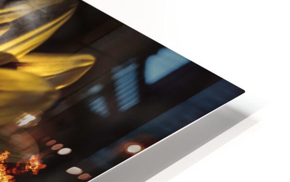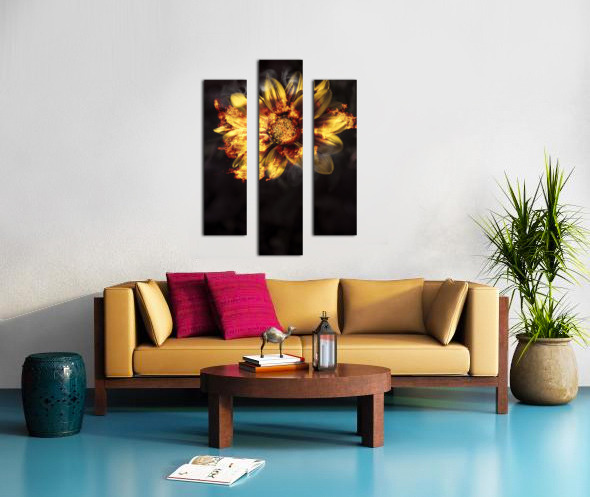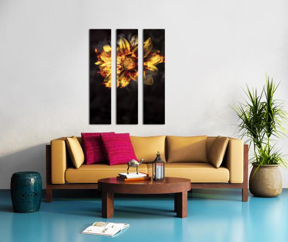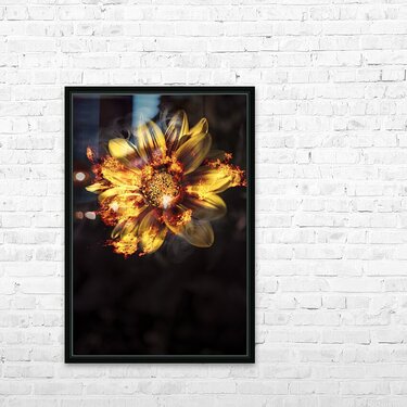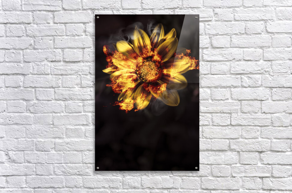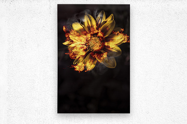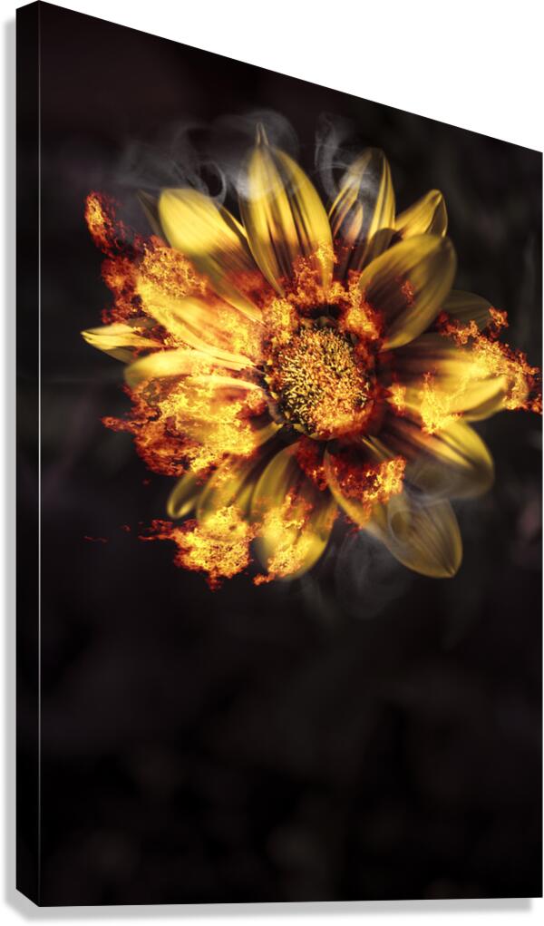 Creative fine artwork of a vibrant yellow flower scorching flames of passion and intimacy when engulfed in a blaze of heated romance