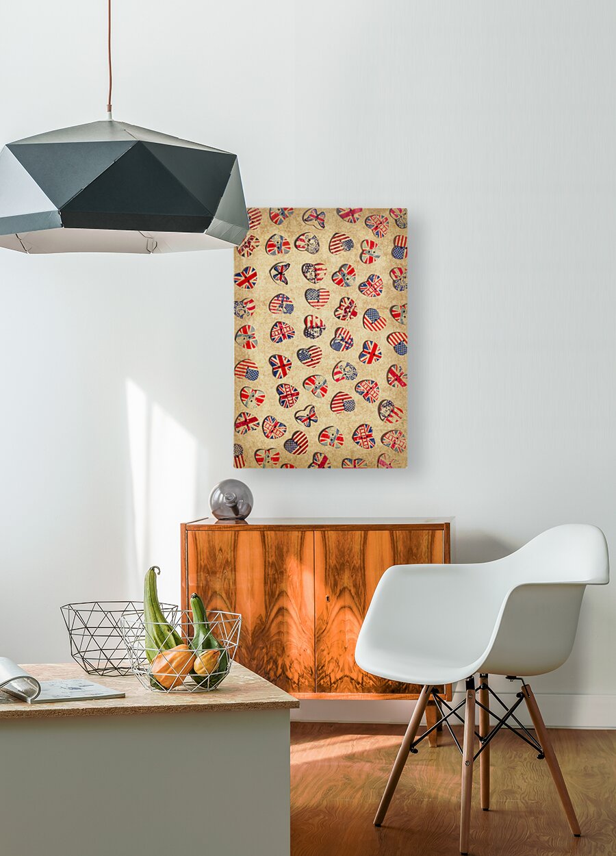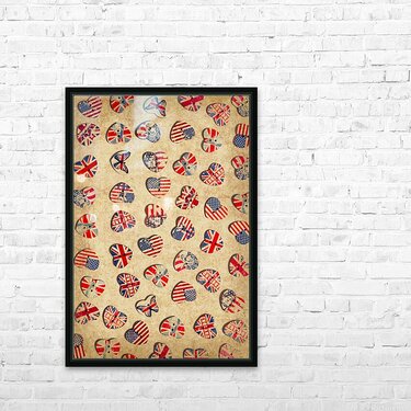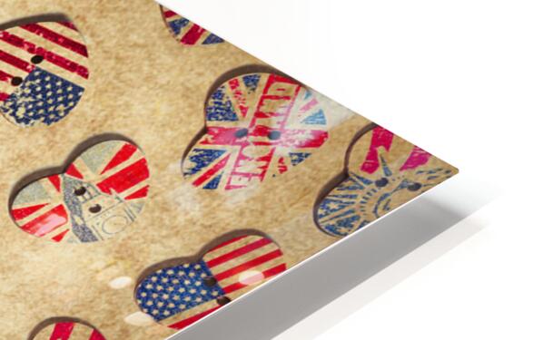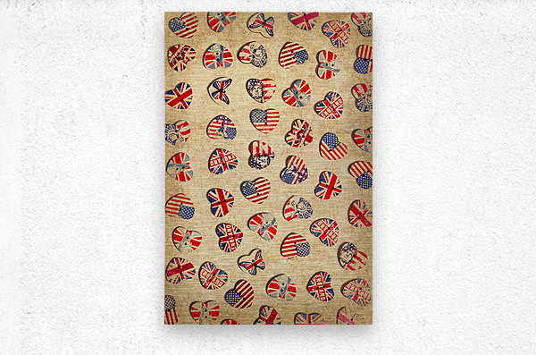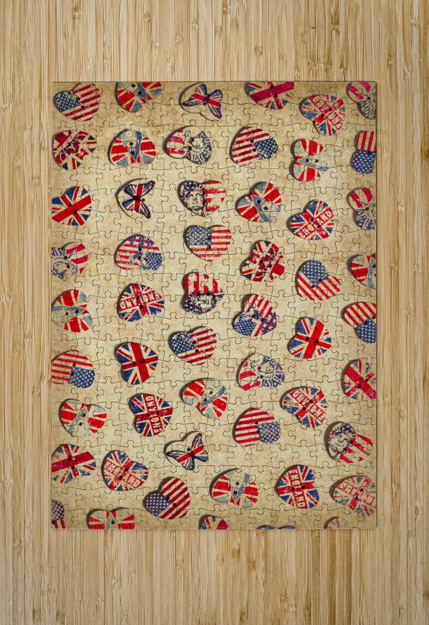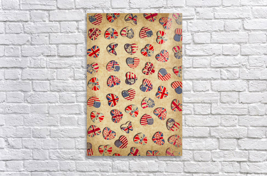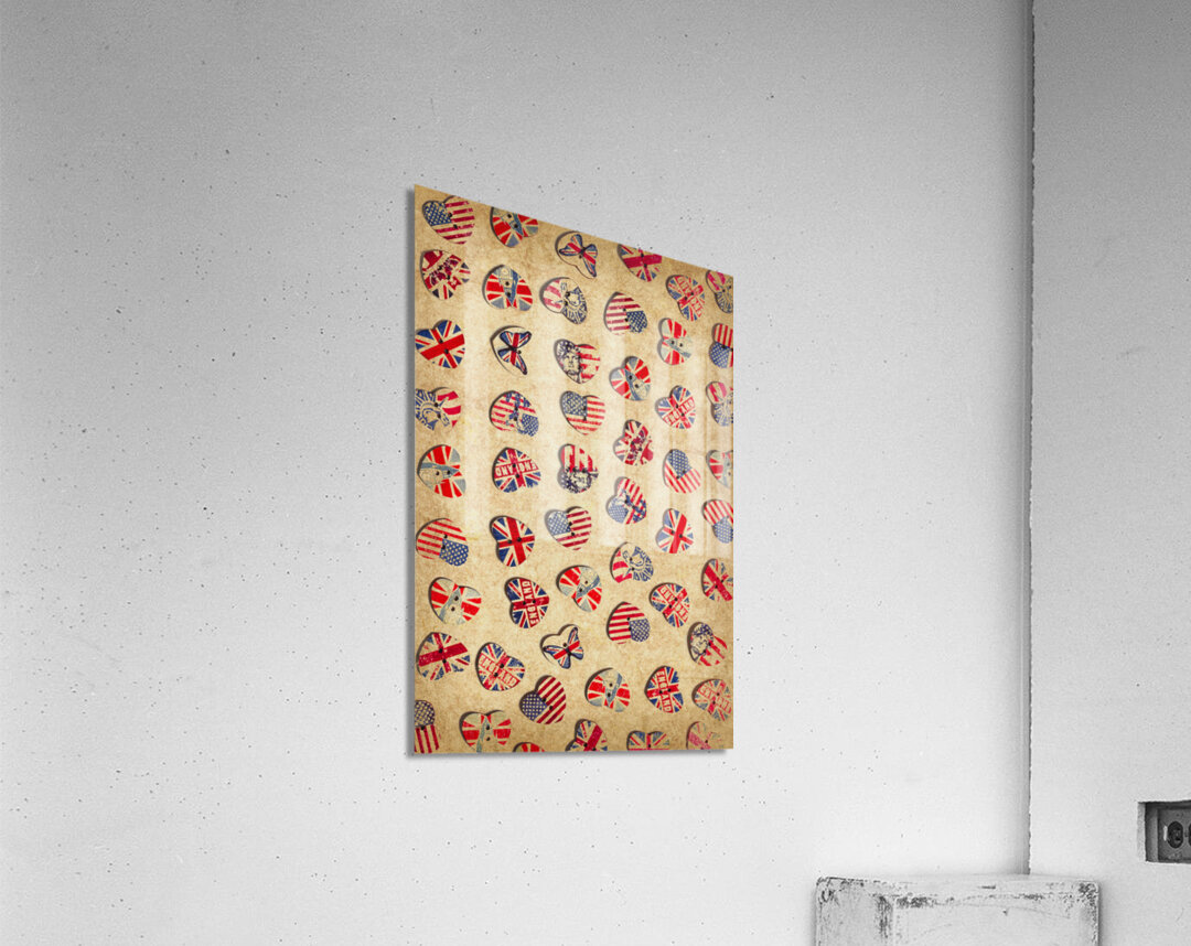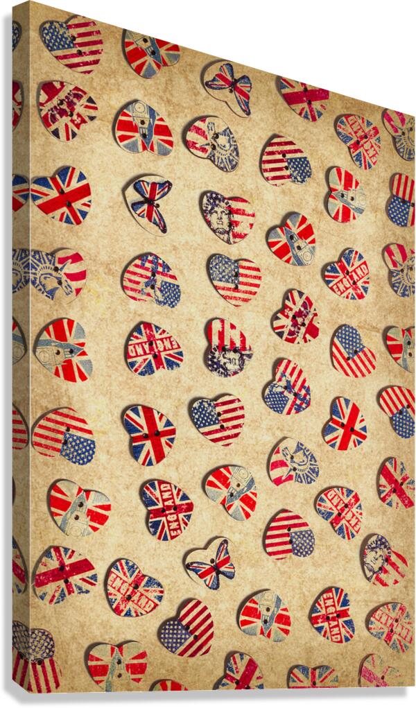 Vintage still life artwork on a mix of rustic heart shaped buttons from the UK and USA. Sovereign state sentiments