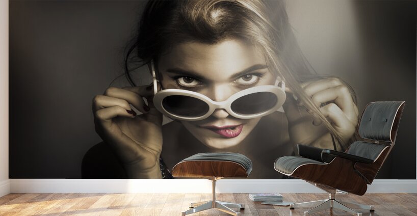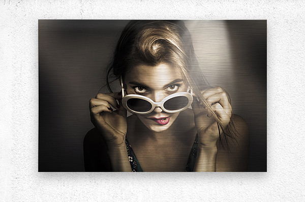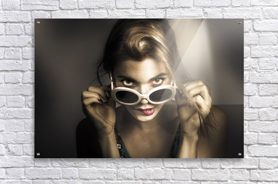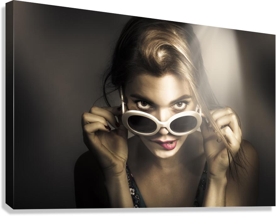 Close up pinup photo of a beautiful young model biting lip while peeking over retro styled glasses. Dark mode styles