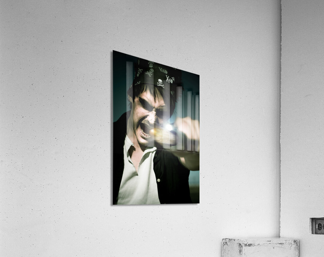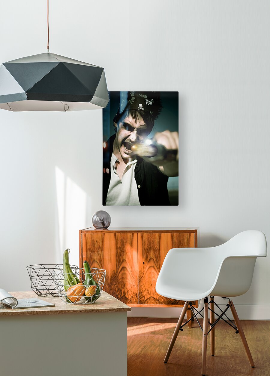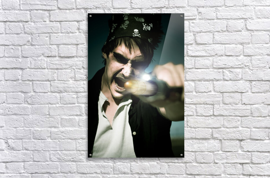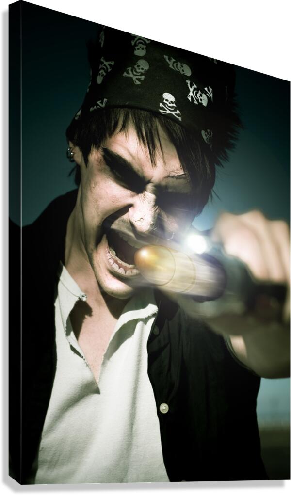 Scary Screaming Angry And Evil Pirate Man With A Hand Gun Taking Aim And Firing A Bullet In A Action Motion Capture Of Mist Smoke And Haze