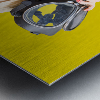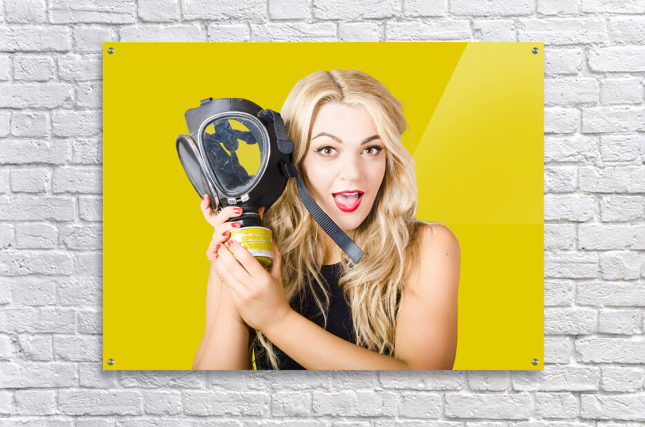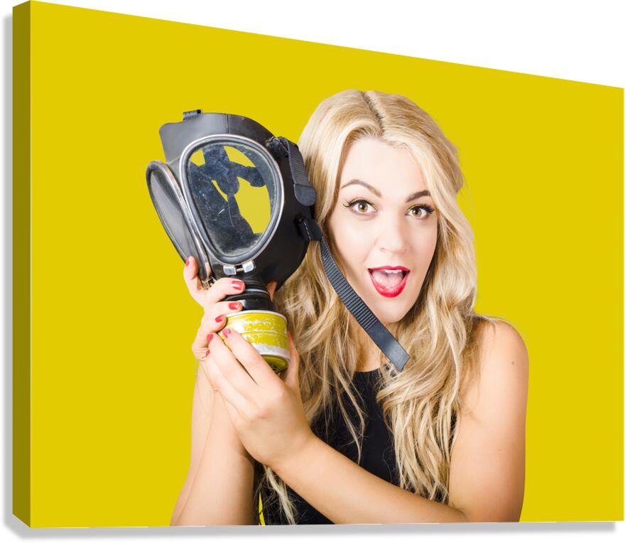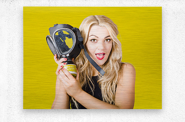 Get this artwork "Woman in fear holding gas mask on white background" in a framed print.
