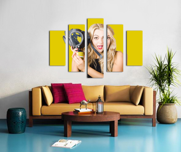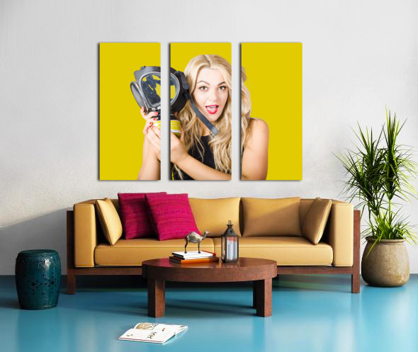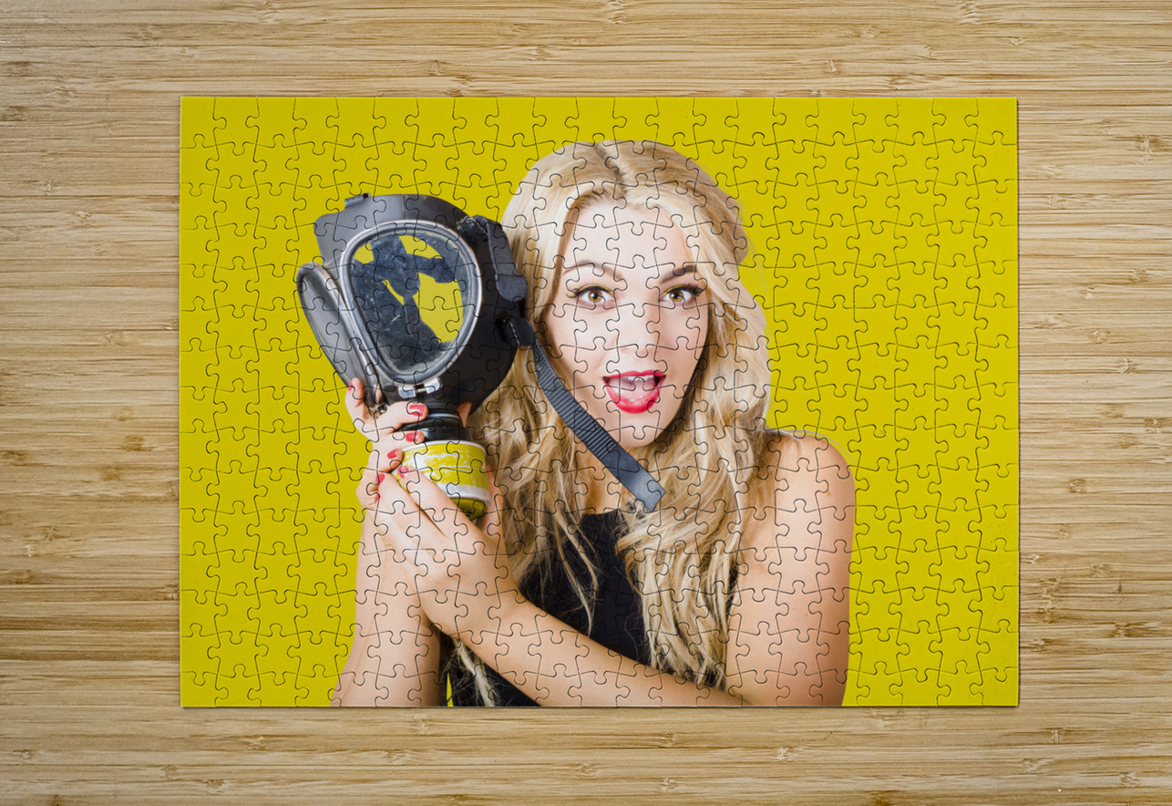 Woman in fear holding gas mask on white background Jorgo Puzzle printing