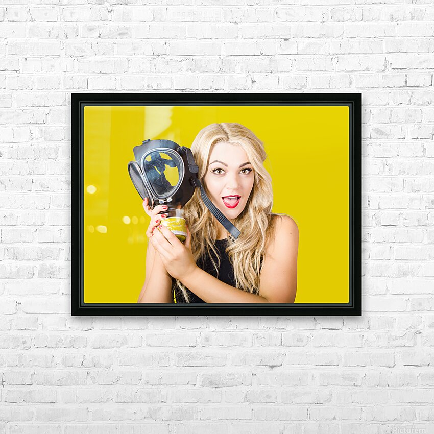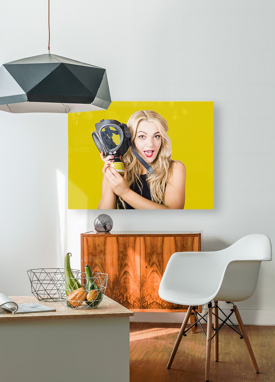 Woman in fear holding gas mask on white background Picture Frame Printing