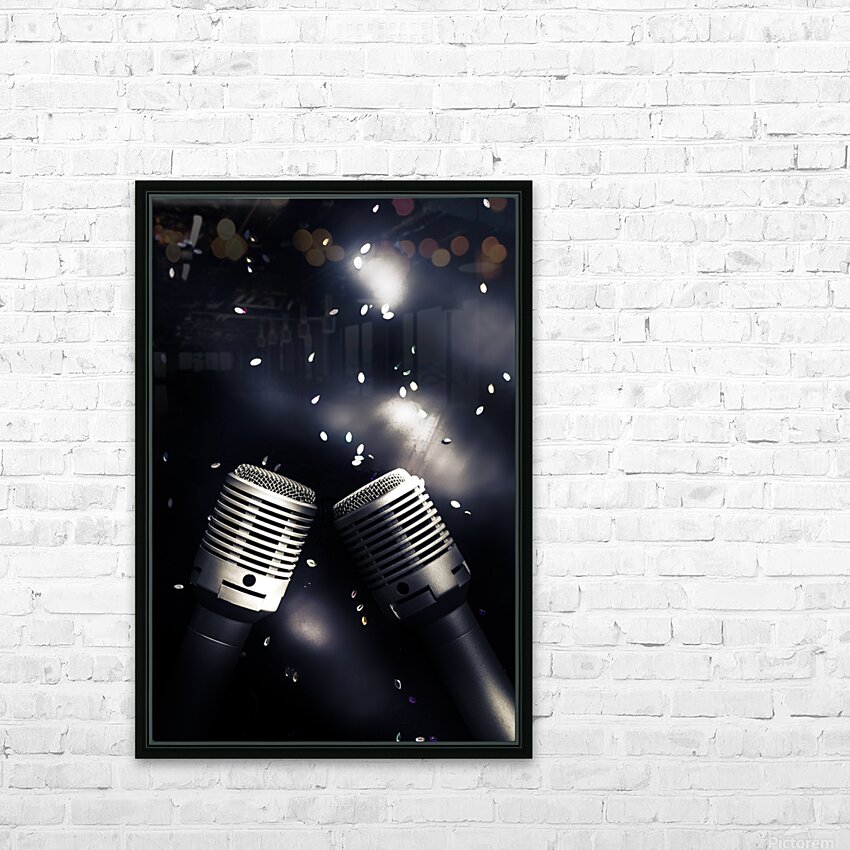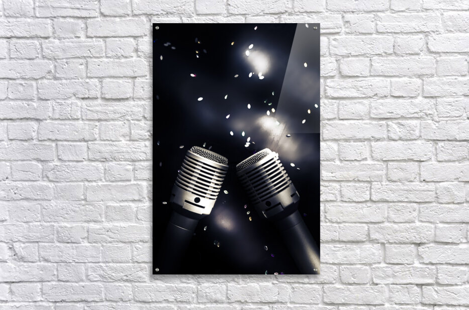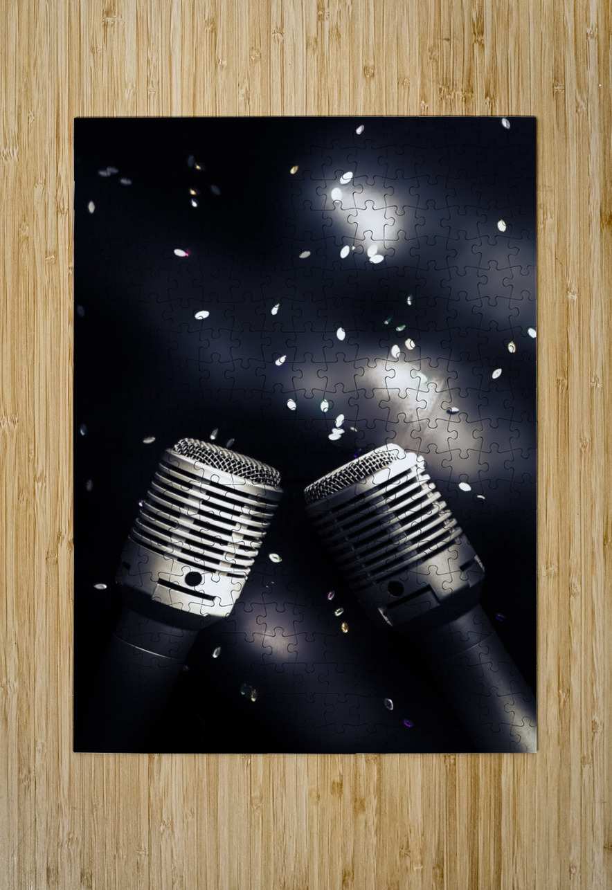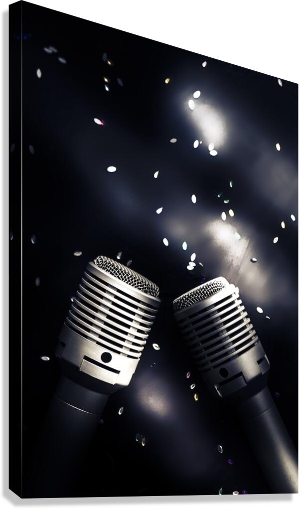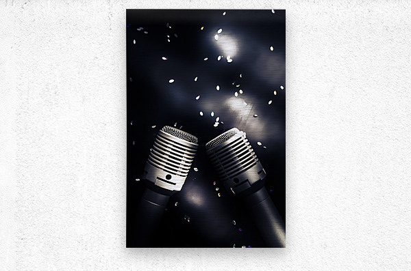 Two grey microphones music equipment for comedy and shows dark background with confetti karaoke concept