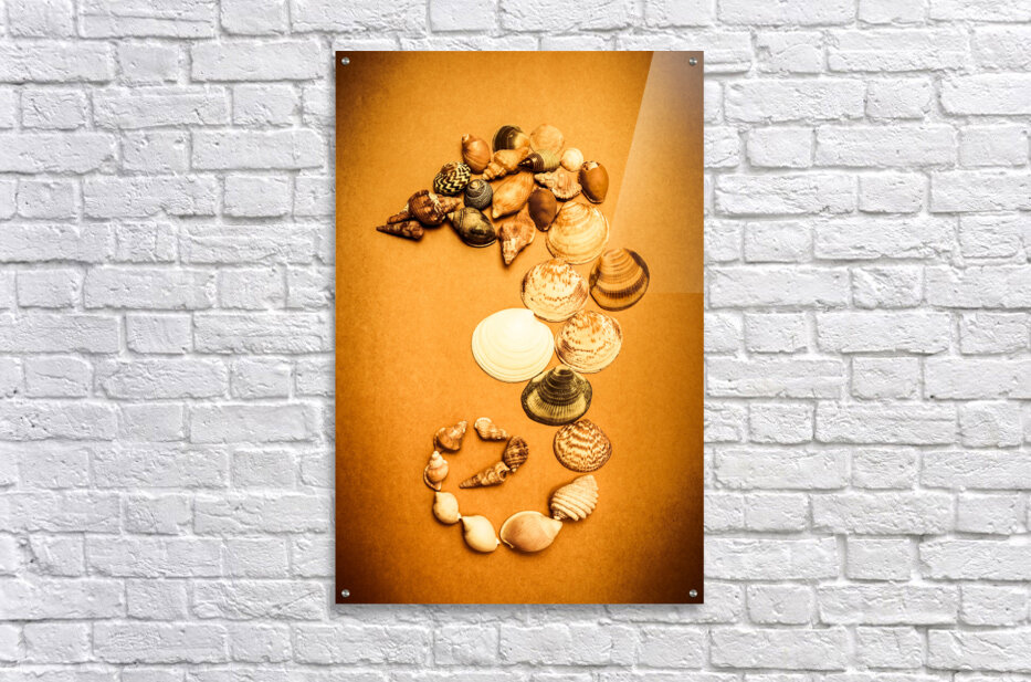 Bright orange artistic still life concept on a collection of sea shells forming the figure of a seahorse. Beach designs