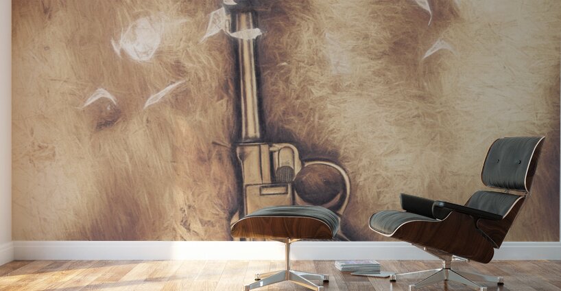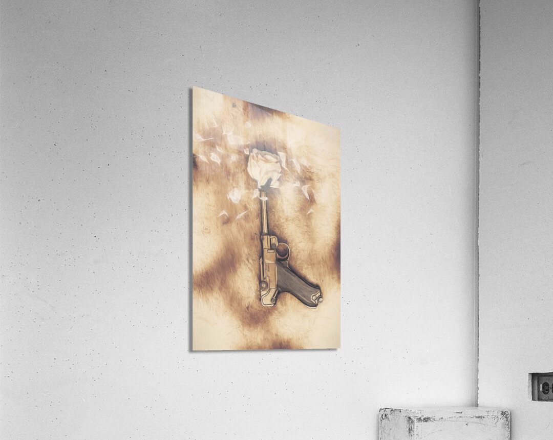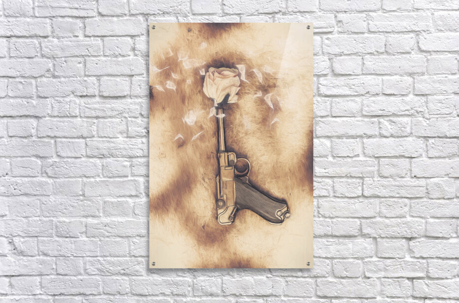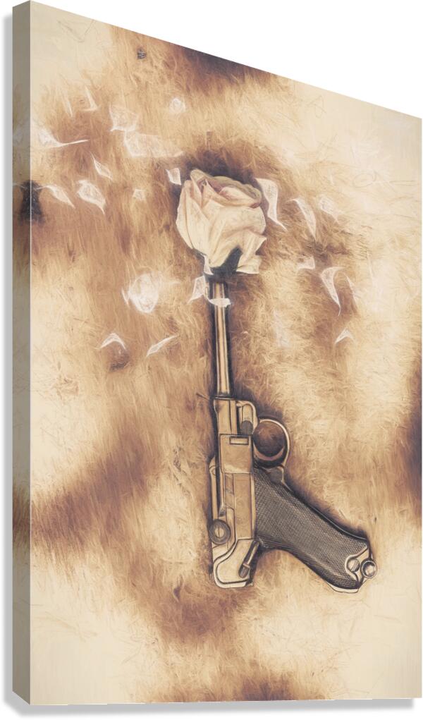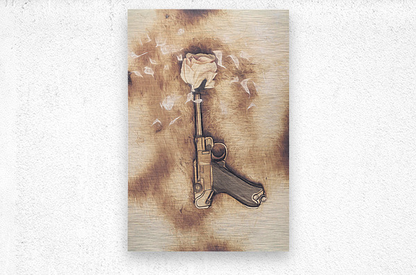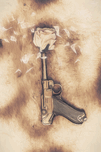 Vintage digital illustration of a pistol capped with a rose bud shooting a petal blast of kindness and hope through the winds of a peacefire treaty. Make love not war