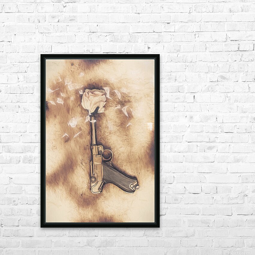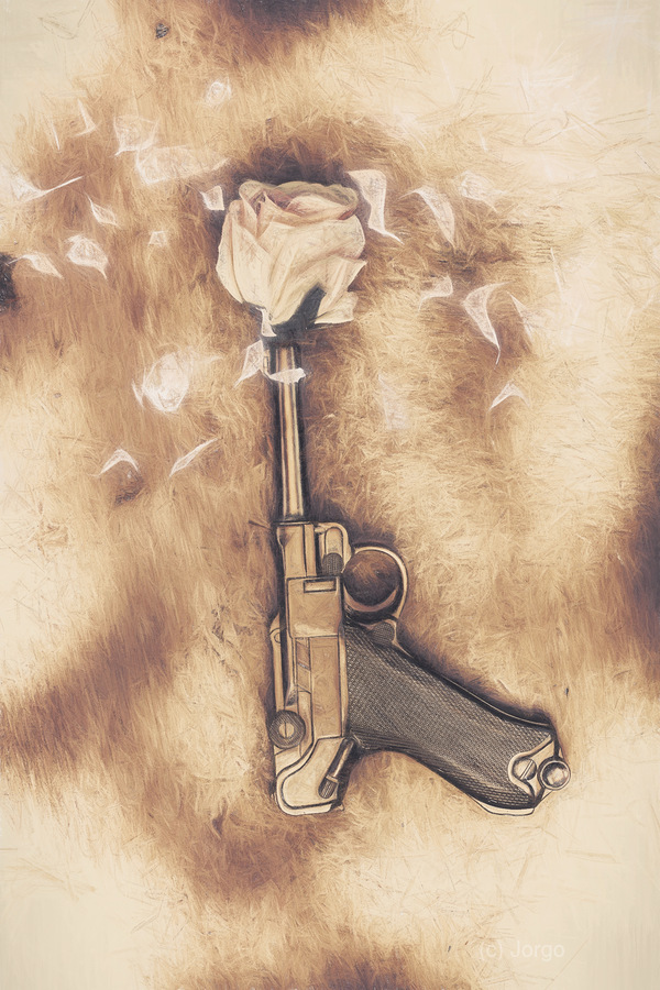Vintage digital illustration of a pistol capped with a rose bud shooting a petal blast of kindness and hope through the winds of a peacefire treaty. M...[+]