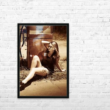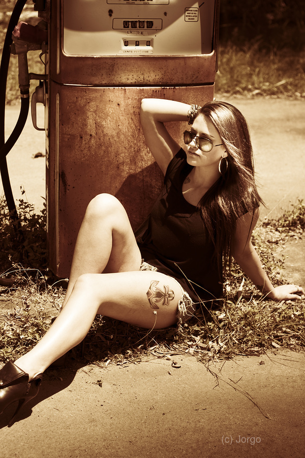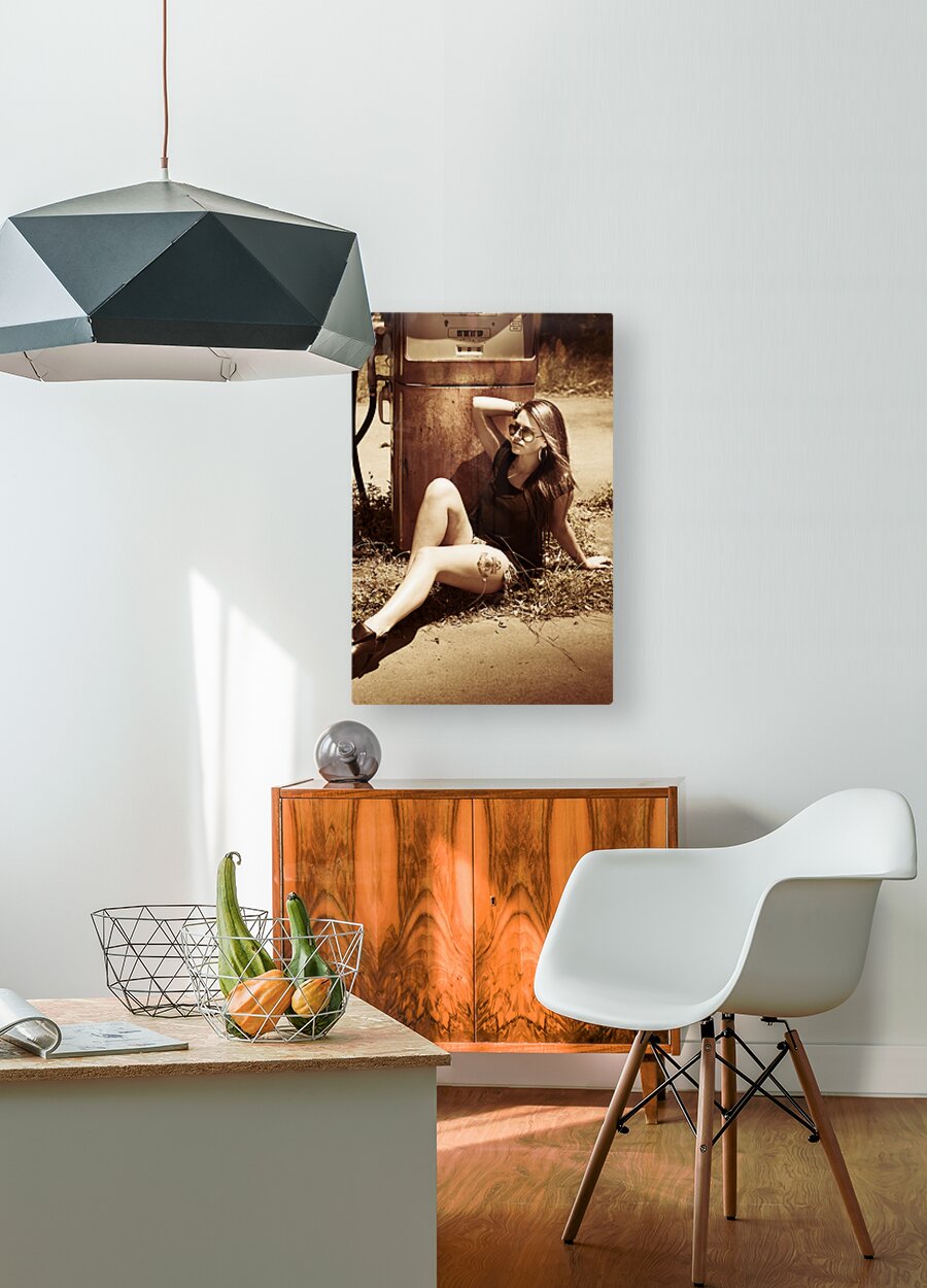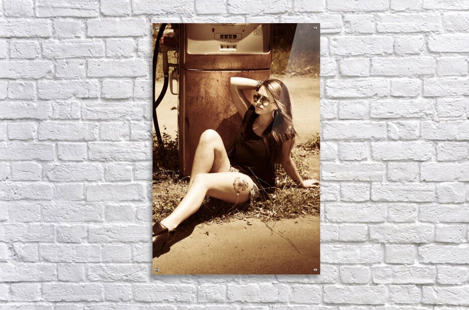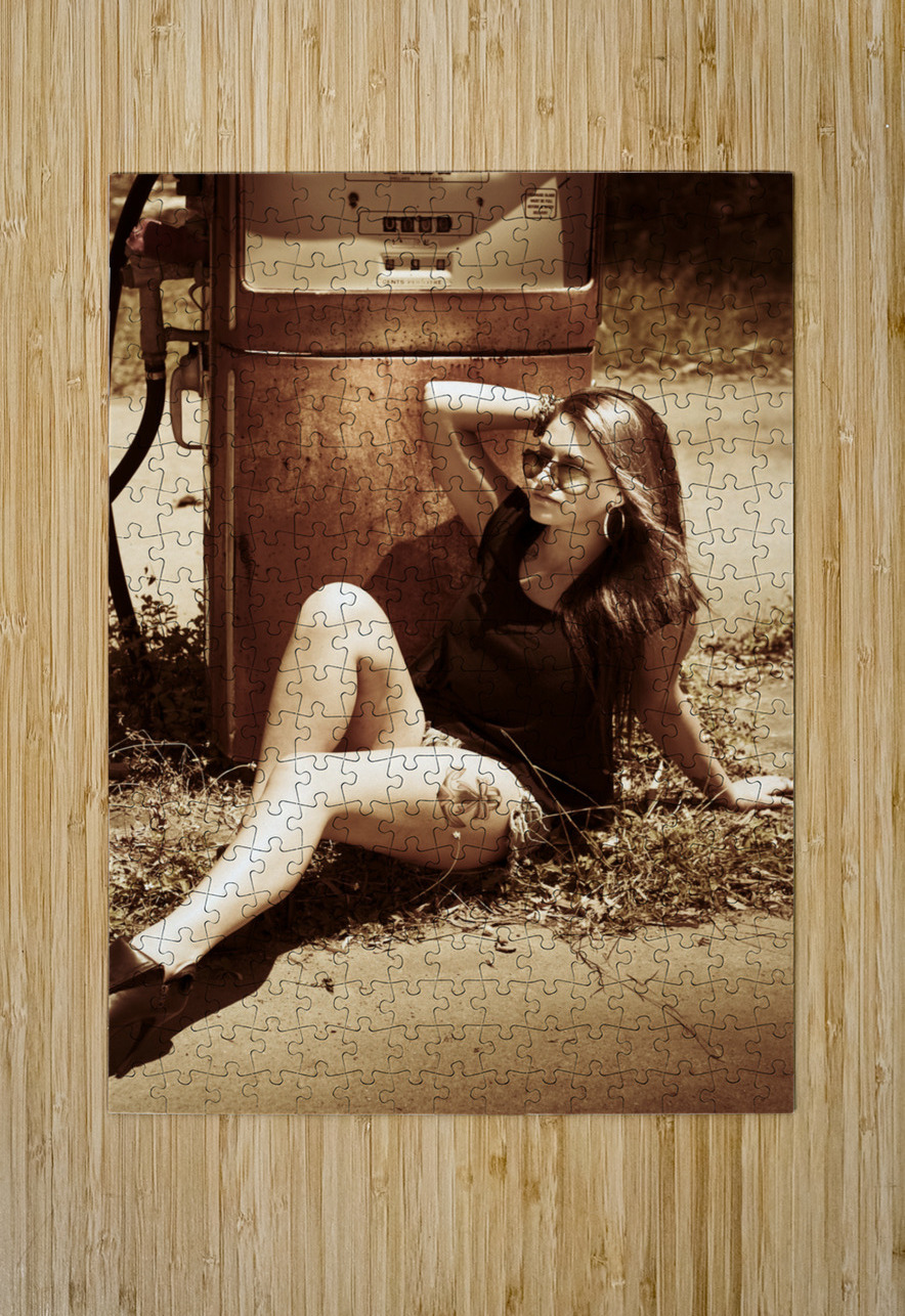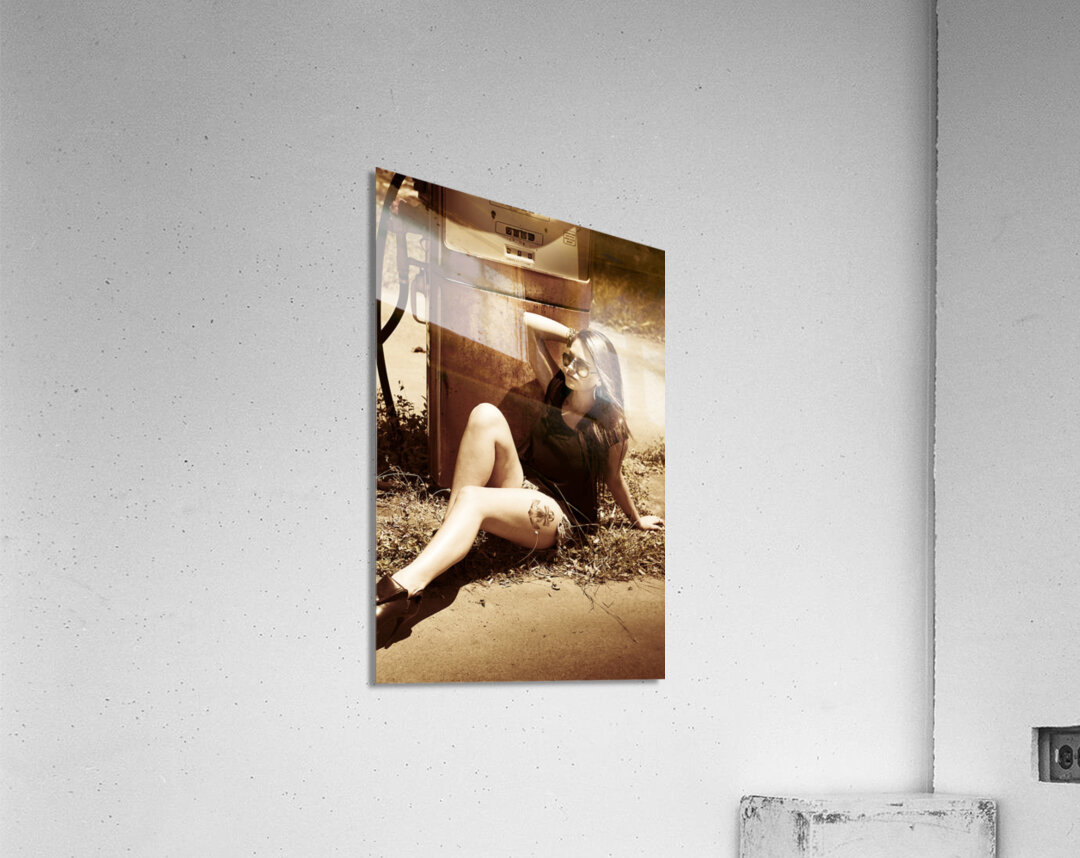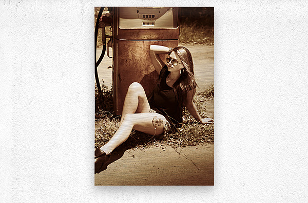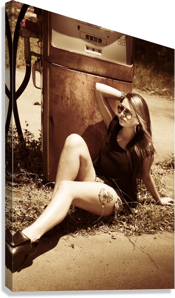 Vintage auto art on a classic car culture girl rest stopping at an old countrified gas station. Road tripping 1960