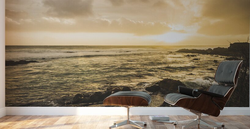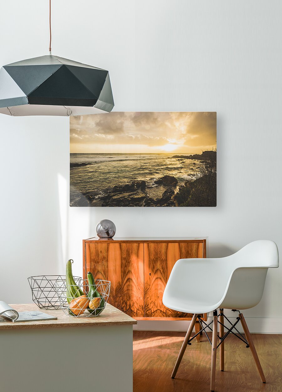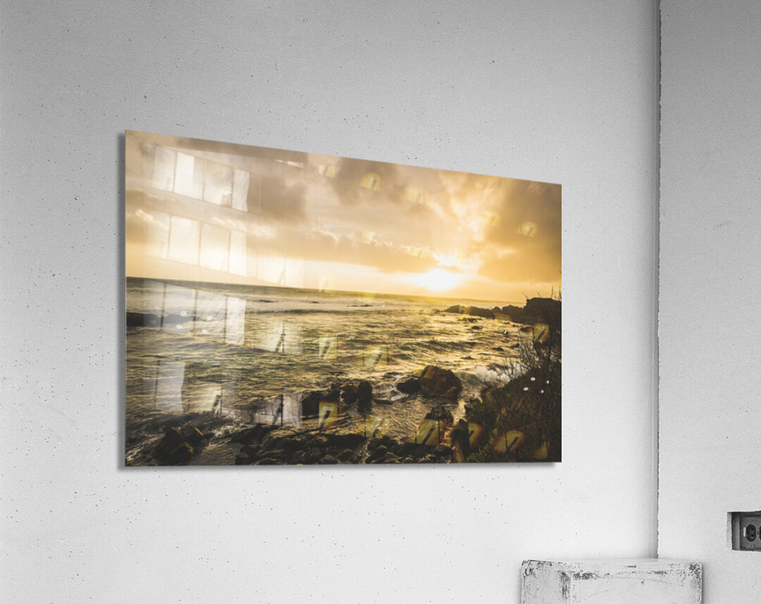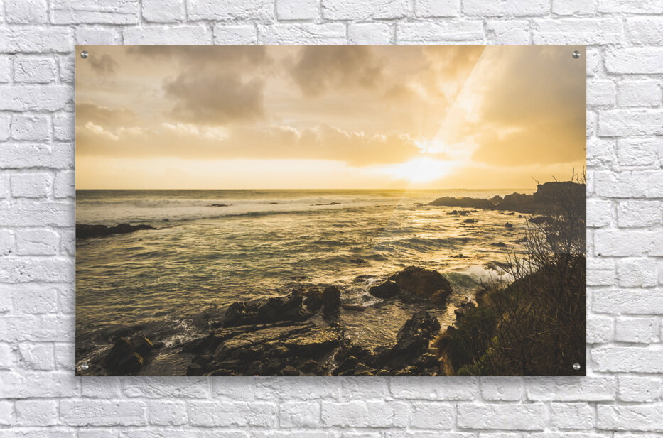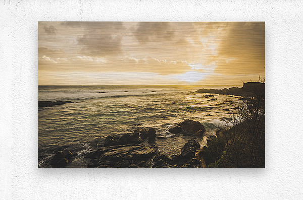 Fine art coastline scene on a sundown of golden light and washed rocky shores. Trial Harbour West Coast Tasmania Australia