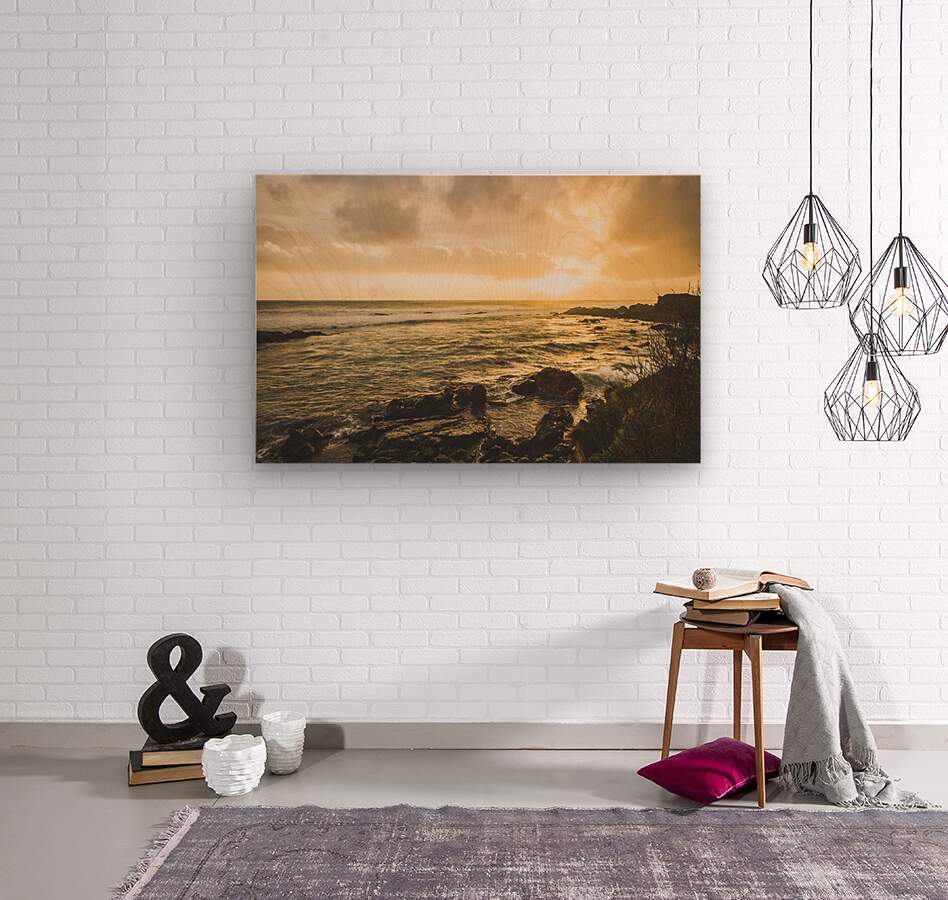 Fine art coastline scene on a sundown of golden light and washed rocky shores. Trial Harbour West Coast Tasmania Australia