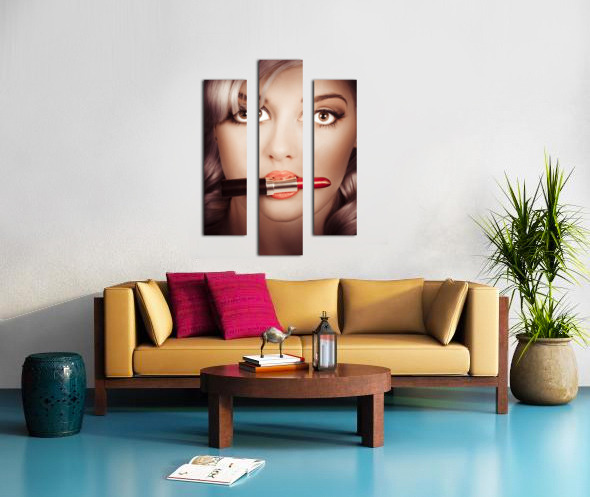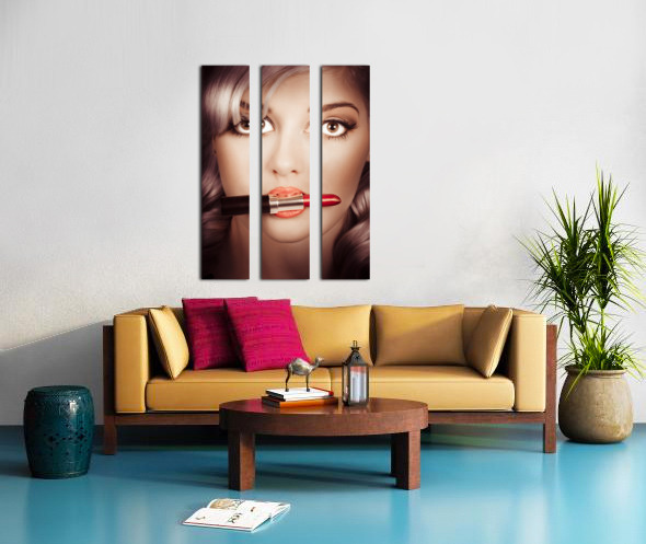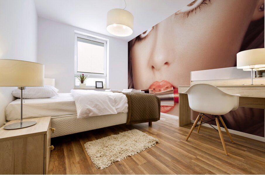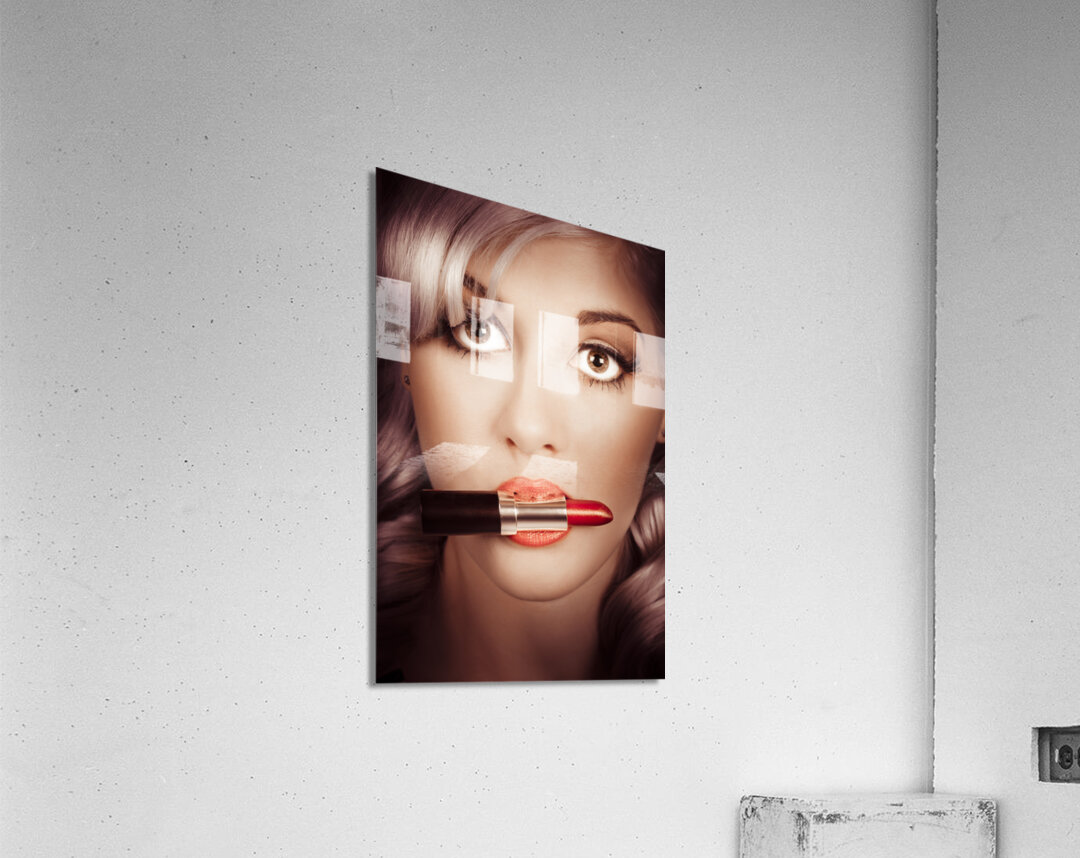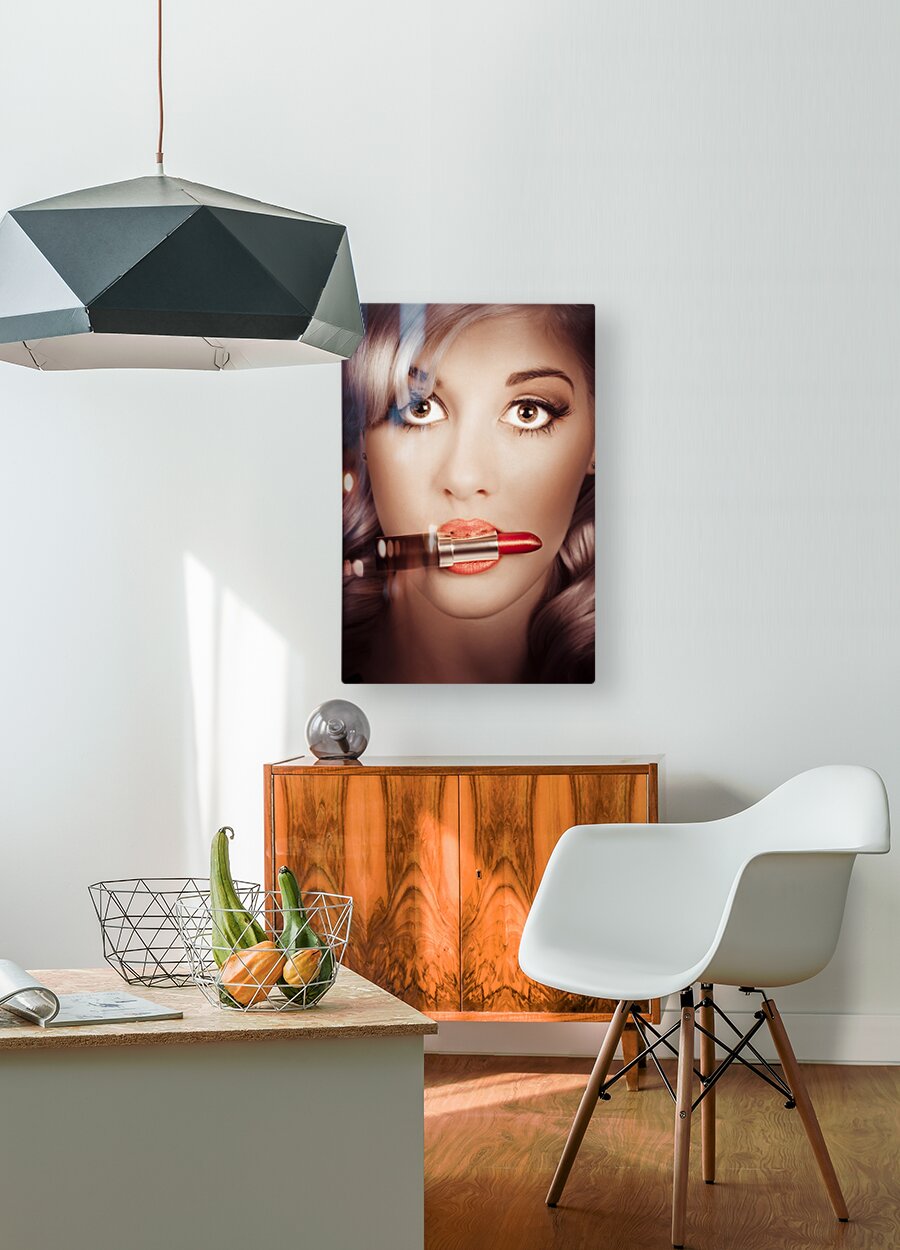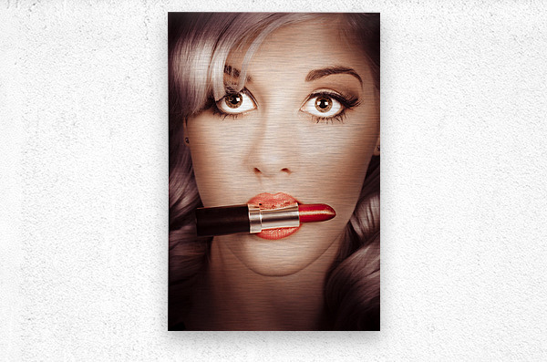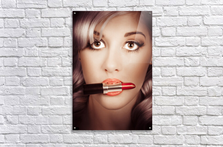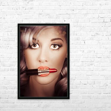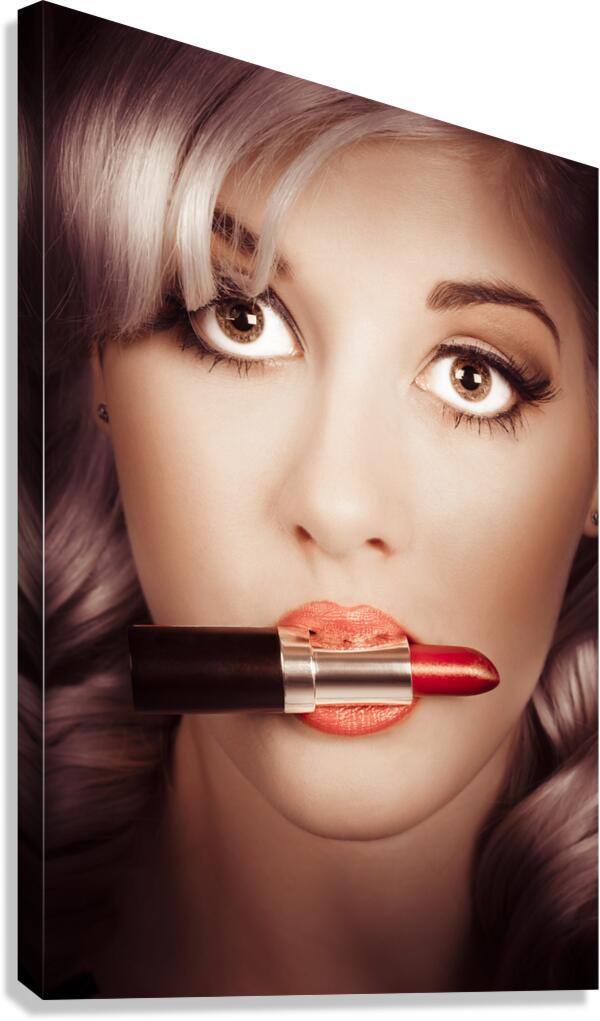 ABOUT THIS ARTWORK: SURPRISED PINUP GIRL WITH LIPSTICK MAKEUP IN MOUTH