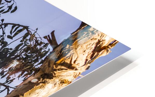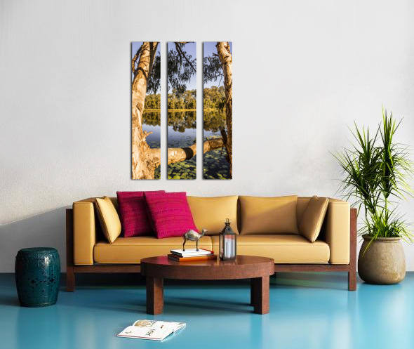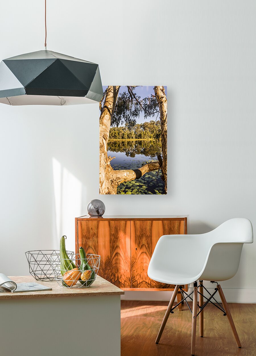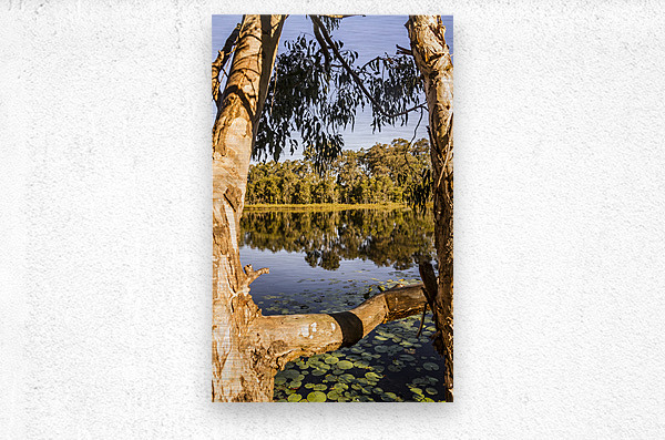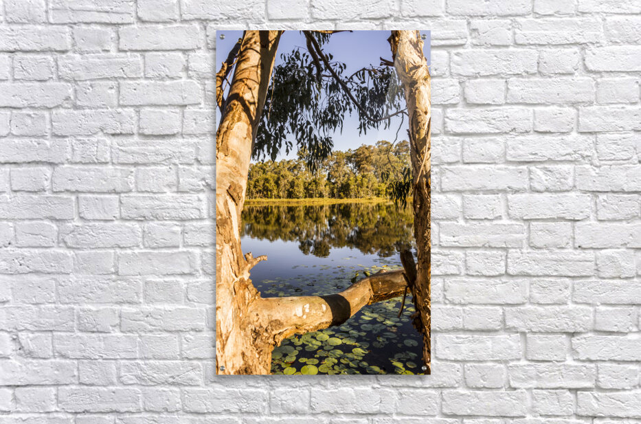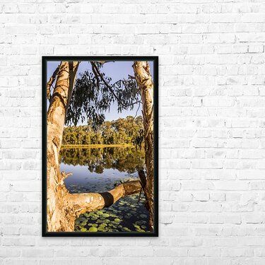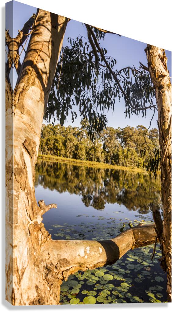 Stillness surrounds the scene of a tree trunk framed lake in wildly serene colour. Murrumba Downs Queensland Australia