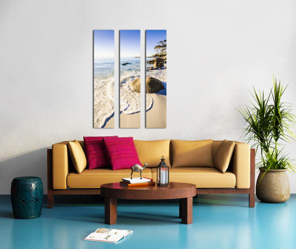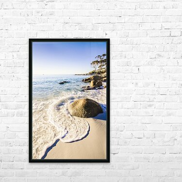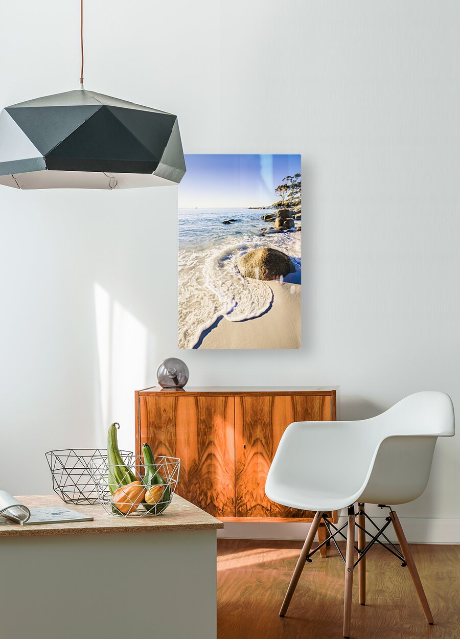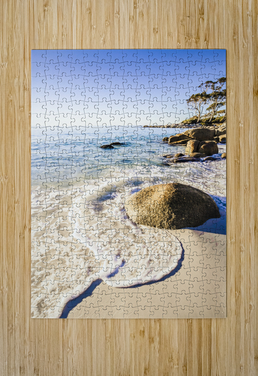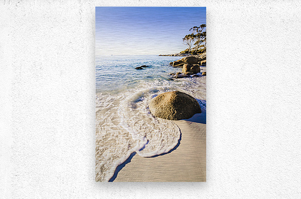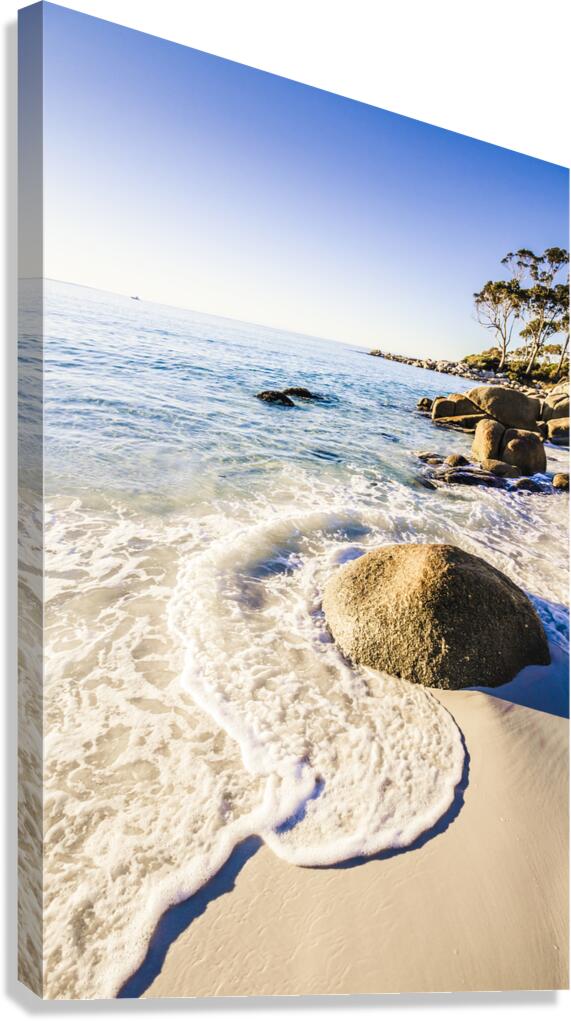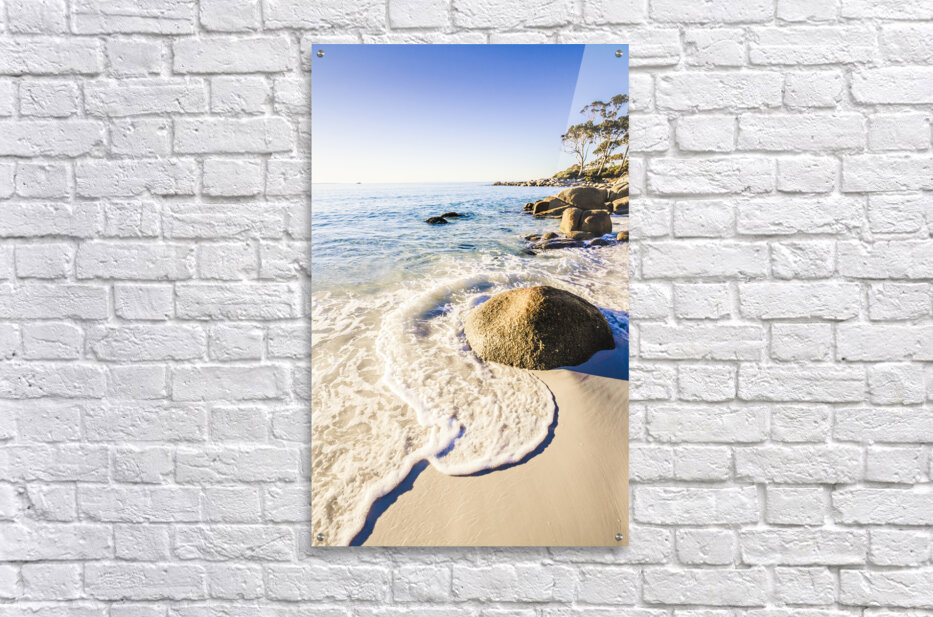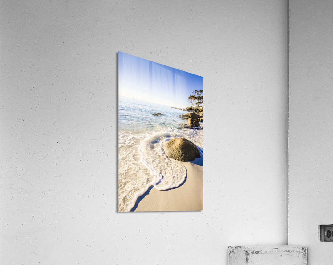 Clean white sand and foamy sea wash in a serene tropical beach scene. Binalong Bay Tasmania Australia
