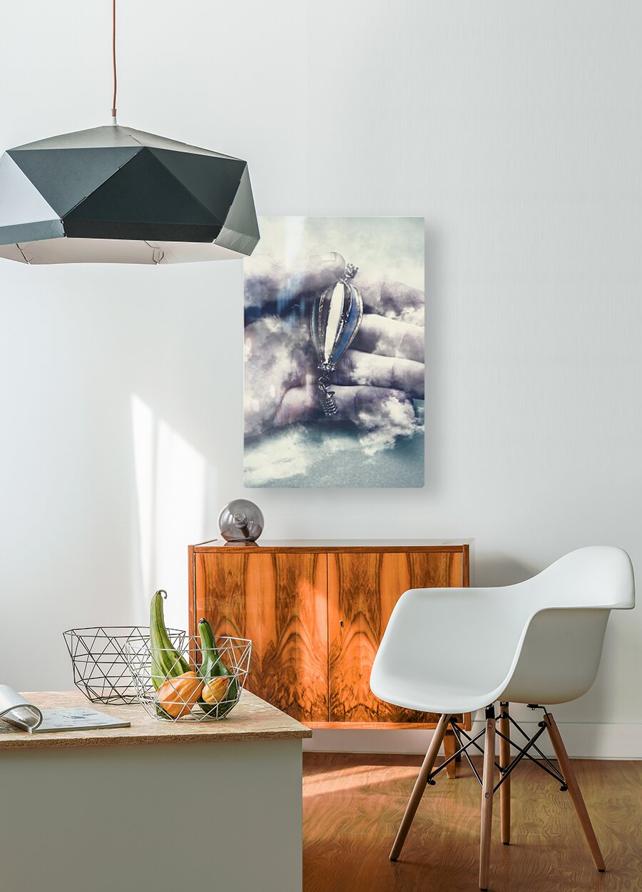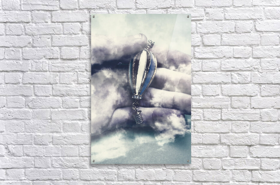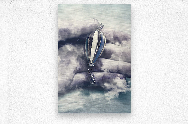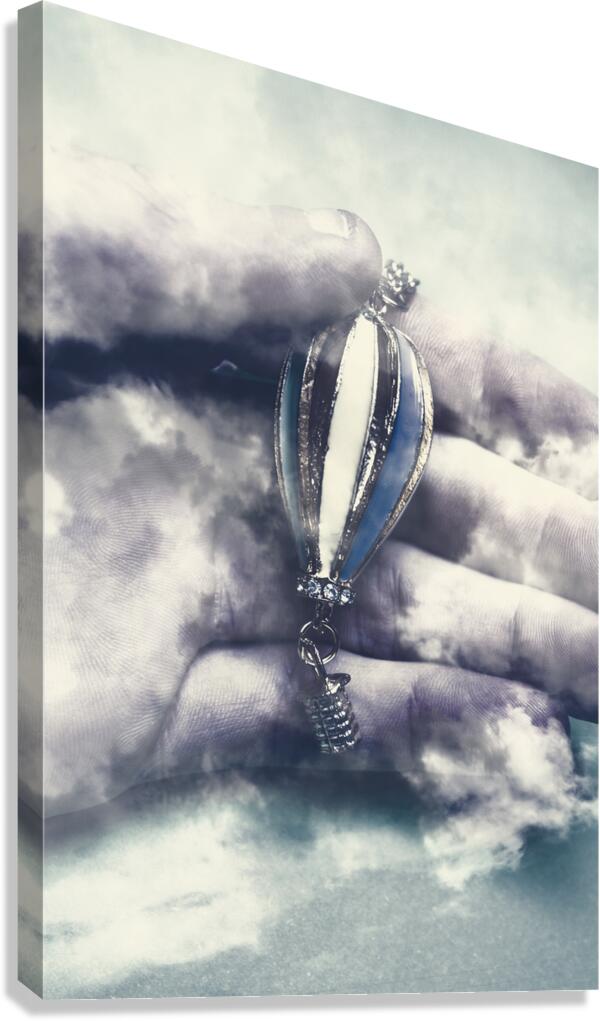 Surrealism artwork on a god like human hand holding hot air balloon in cloudy fog of mystery. Fantasy flights