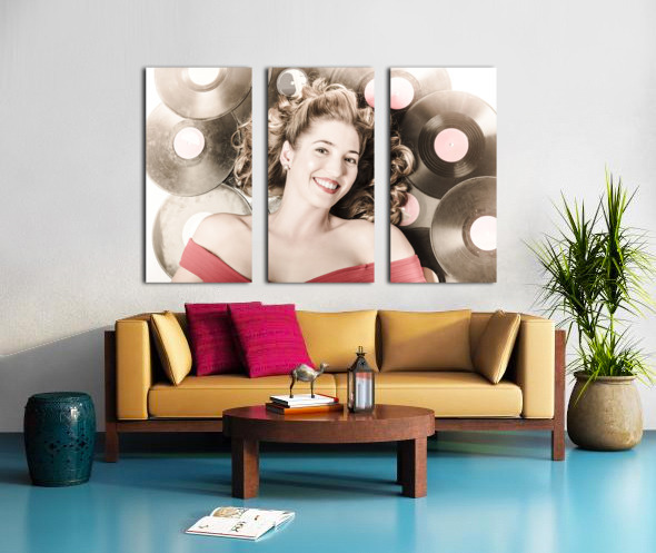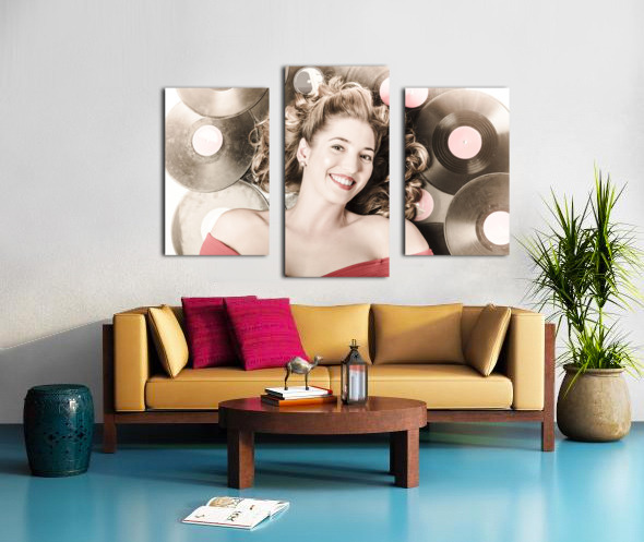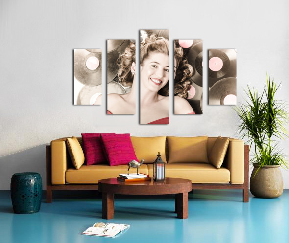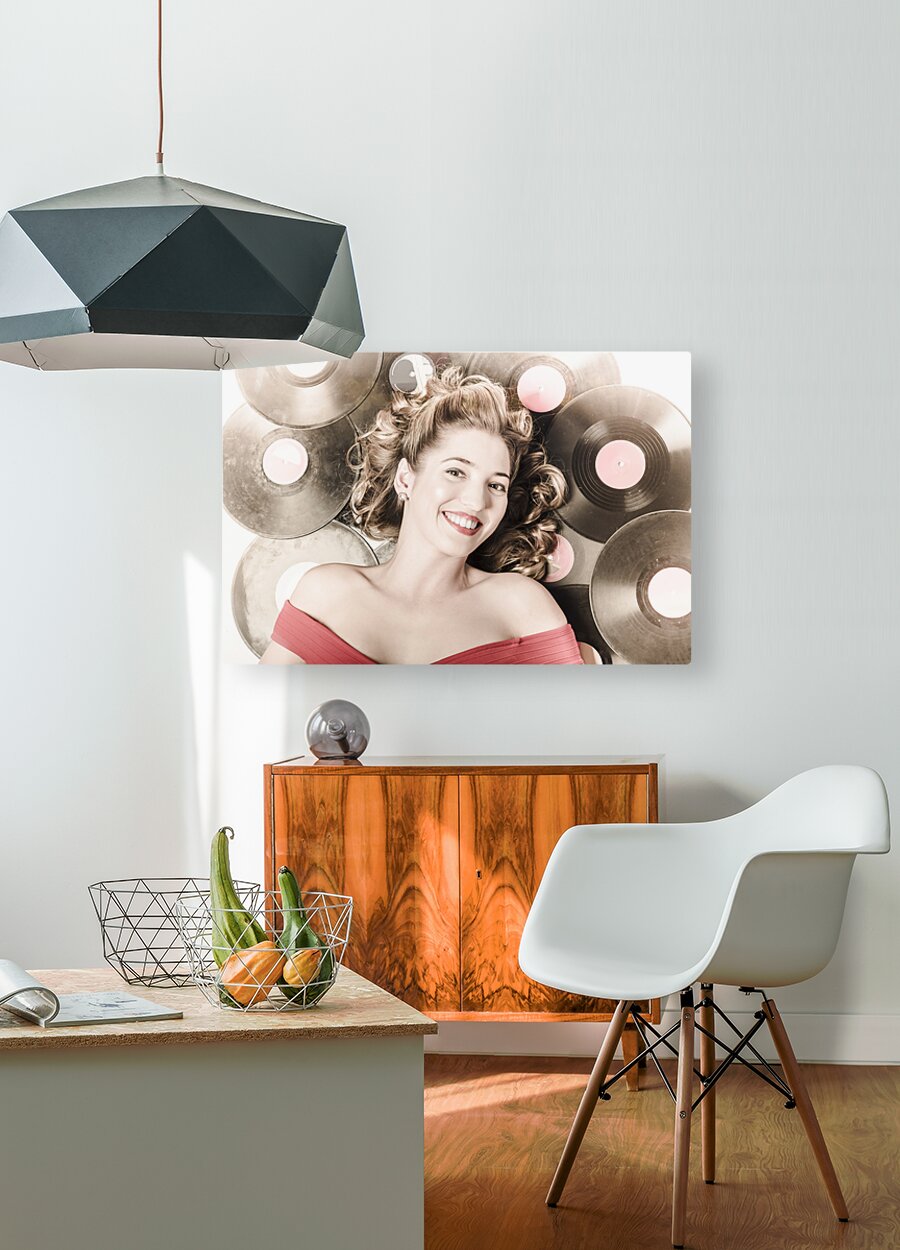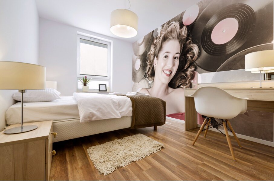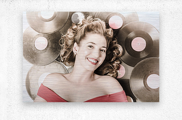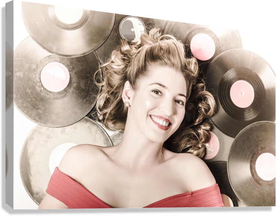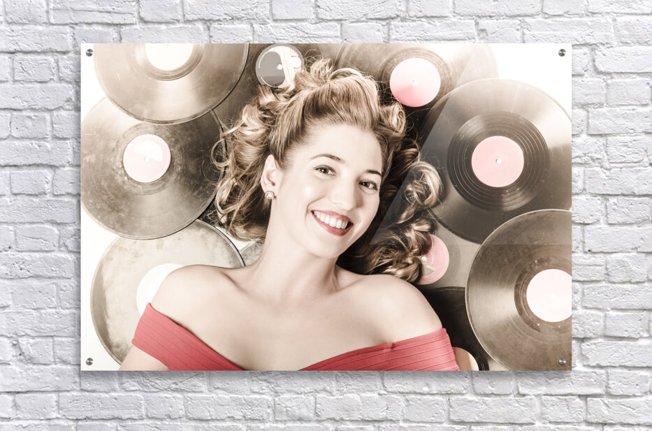 Retro pin-up woman with rocking hairstyle laying down some music against a set of 78rpm vintage vinyl records in classic fashion style