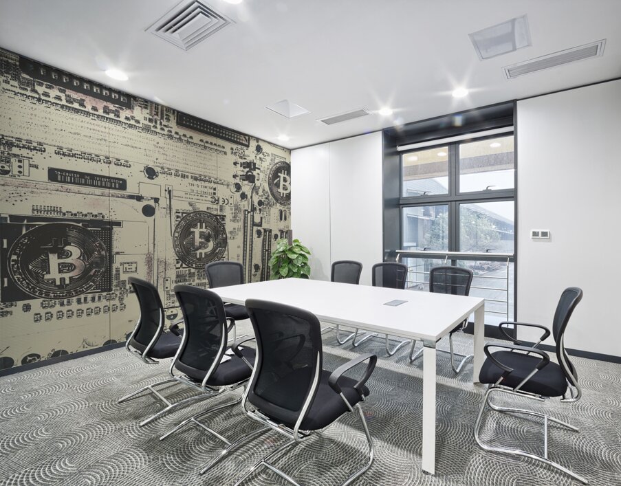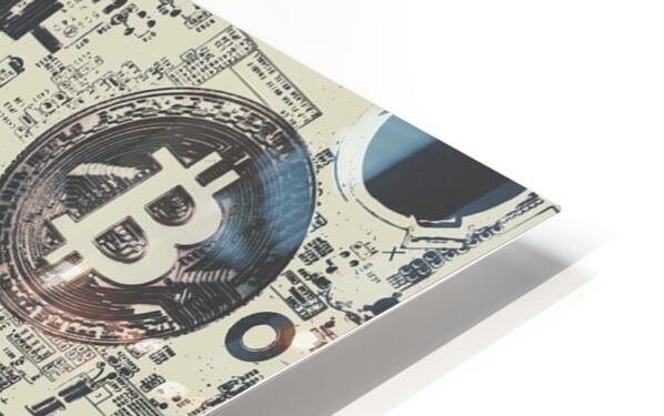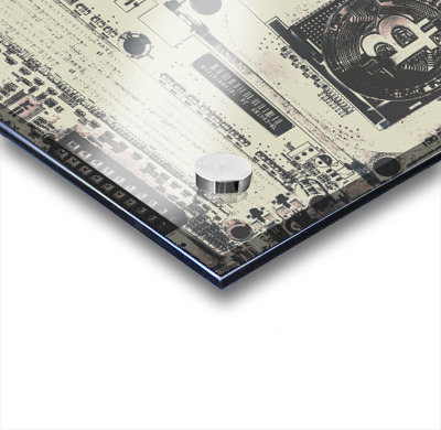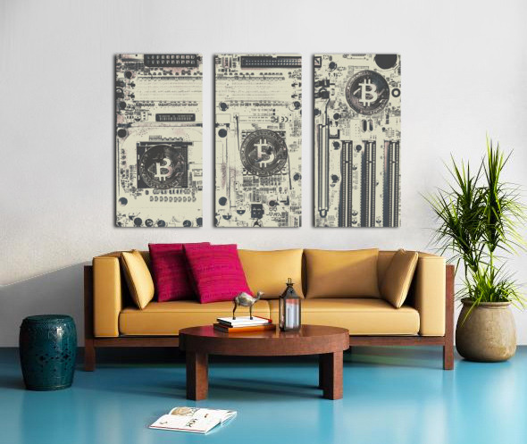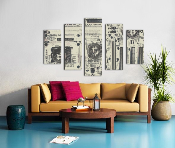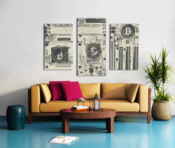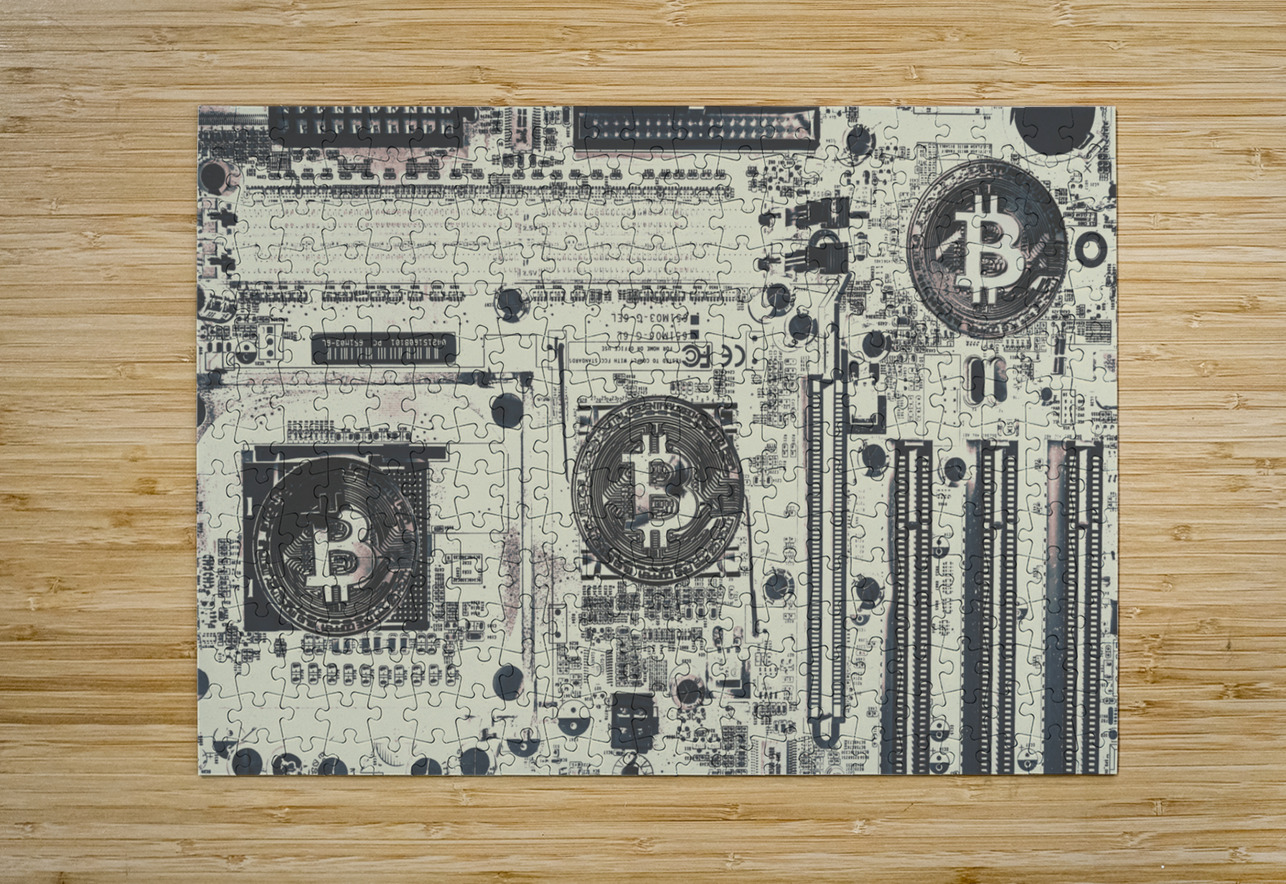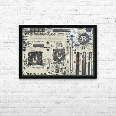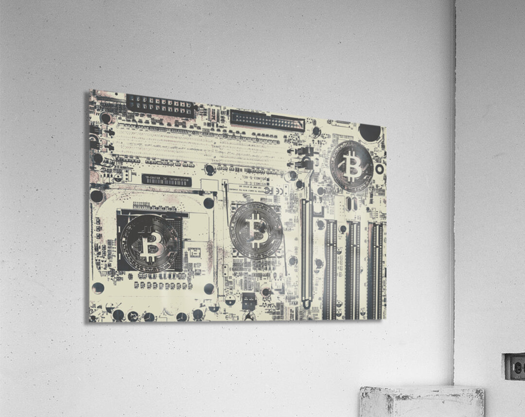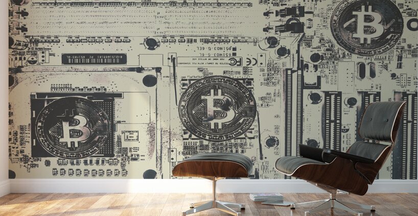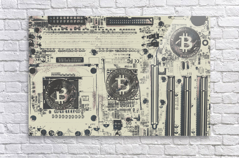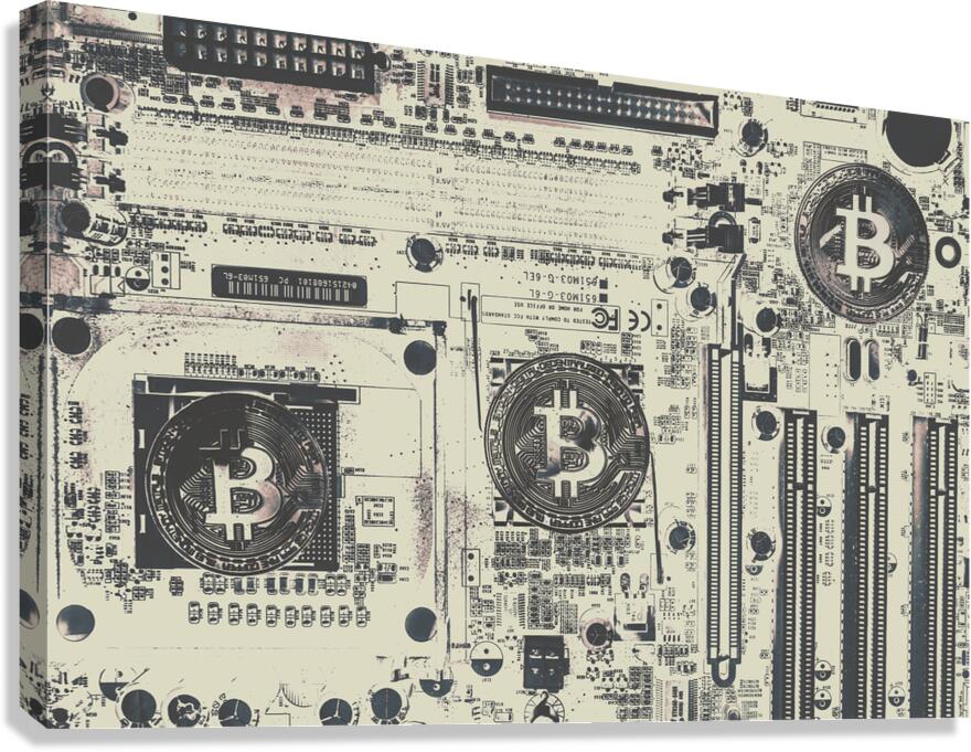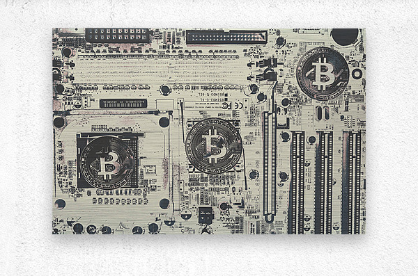 Fine art design on a computational scene of bitcoin motherboard chips processing transactions. Block mining