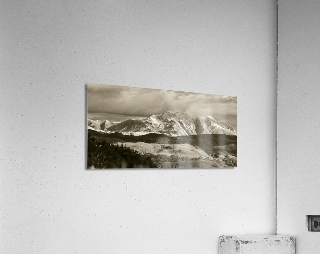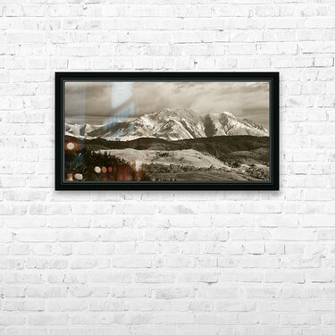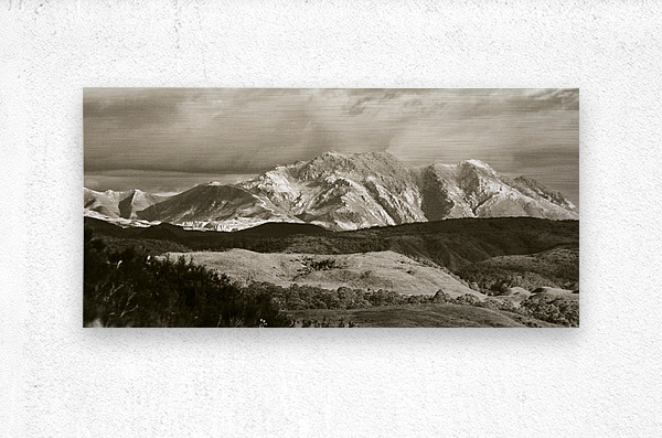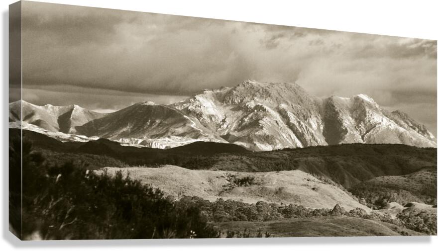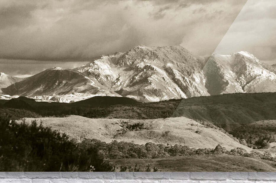 Vintage fine art photo on a sepia toned piece of the West Coast Range with foothills meeting rugged mountain tops. Taken with telephoto from Zeehan T...[+]