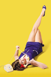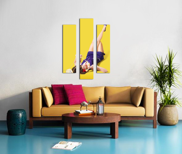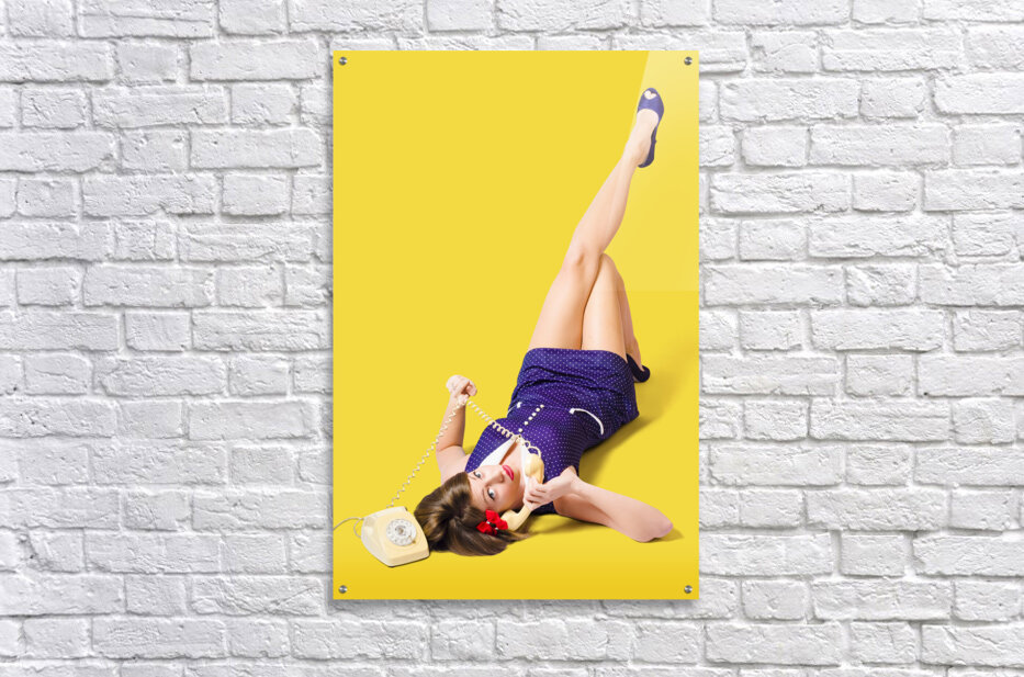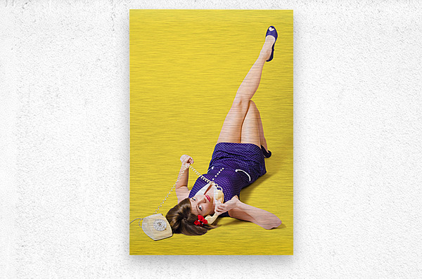 Old 50s photo of a retro pinup girl flirting on phone in full length wearing classic fashion accessories with polkadot dress and purple heels on yellow background