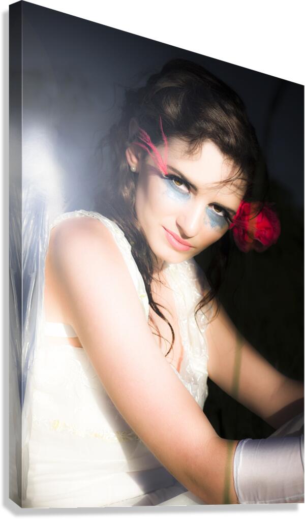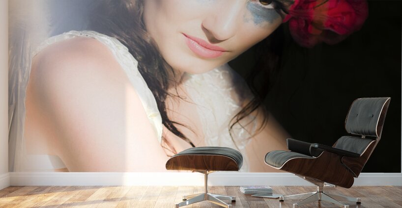 Soft And Delicate Portrait Of A Beautiful Angel Shimmering And Gleaming White In The Darkness Wearing A Red Rose In Her Hair And Angel Wings On Her Ba...[+]