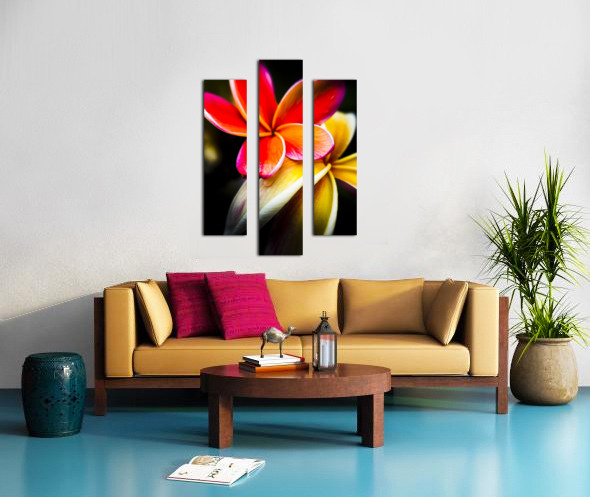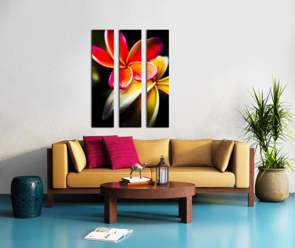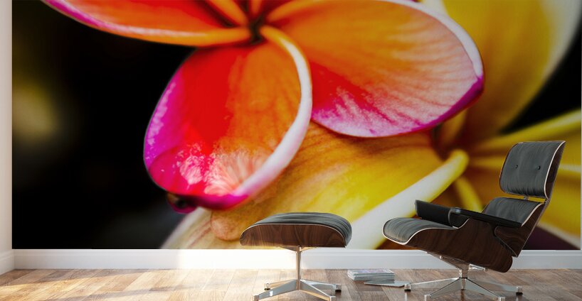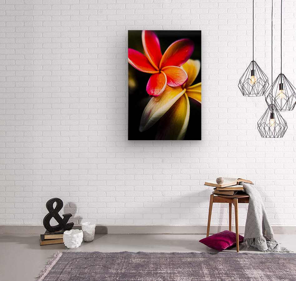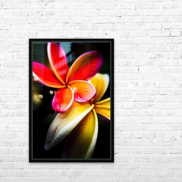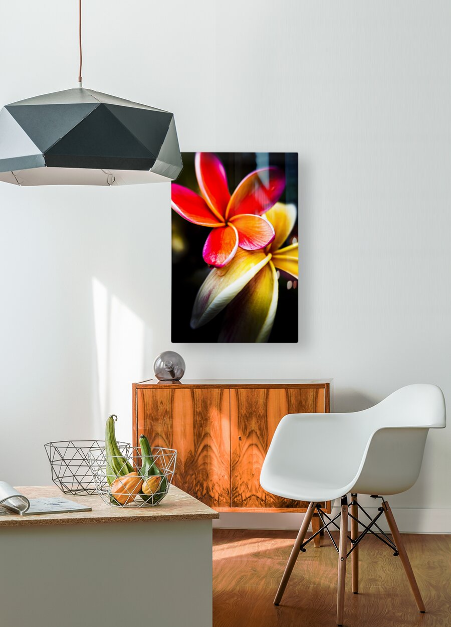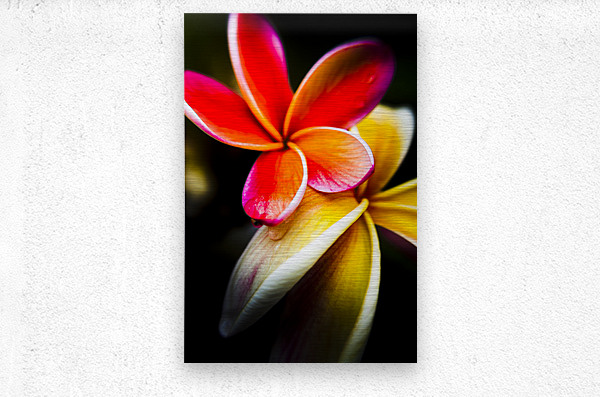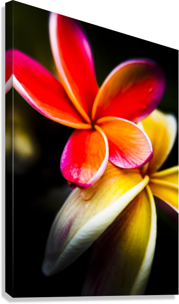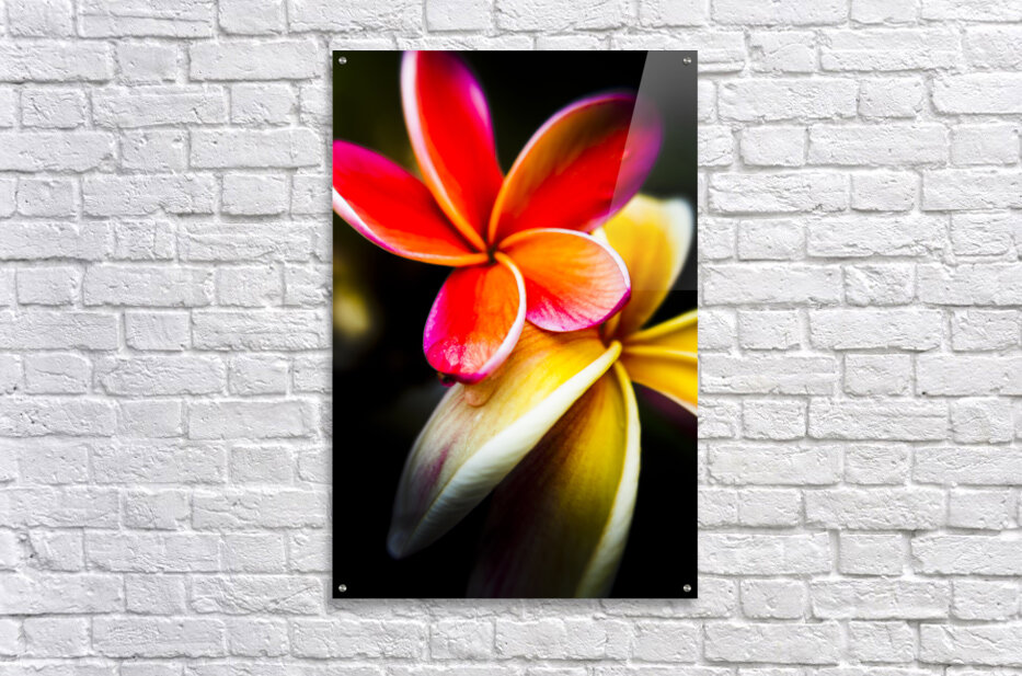 Wild summer flower art on a couple of vibrant frangipani flowers in touching display. Taken: North Stradbroke Island Queensland Australia
