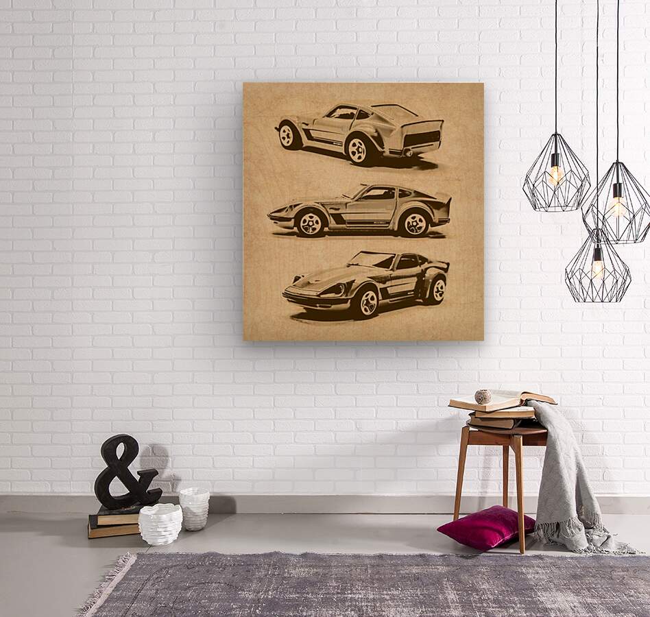 Vintage automotive photography on a lineup of 3 model Nissan Fairlady Z Series in old racing style