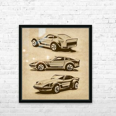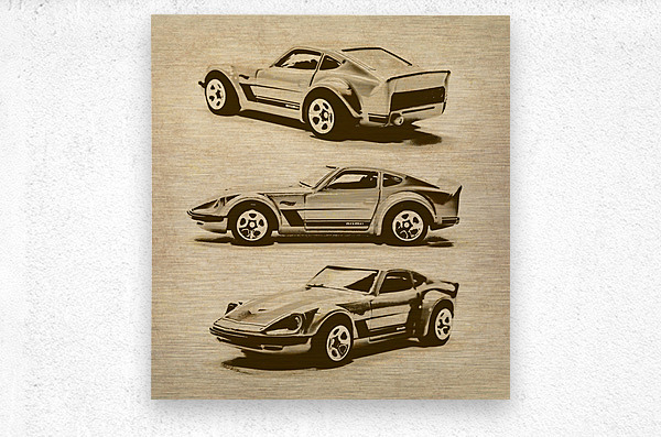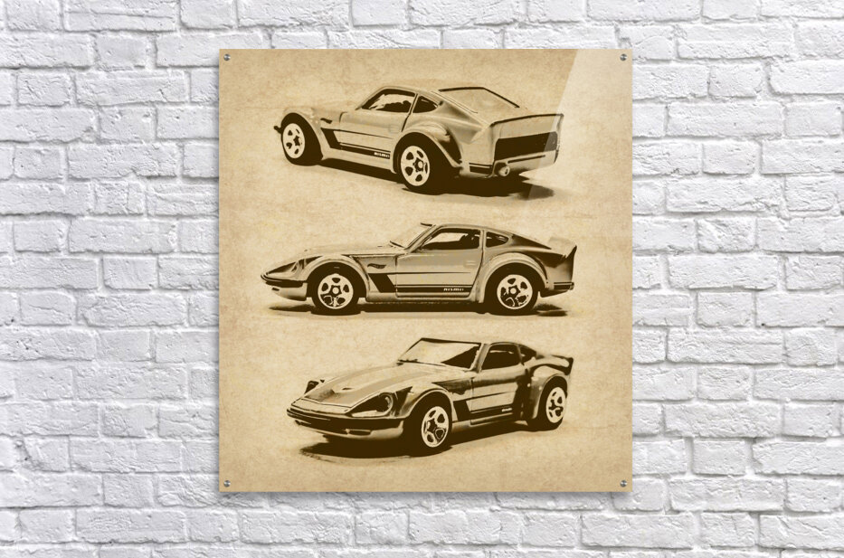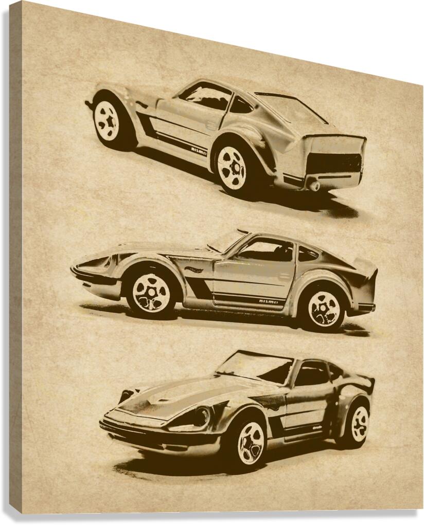 Vintage automotive photography on a lineup of 3 model Nissan Fairlady Z Series in old racing style