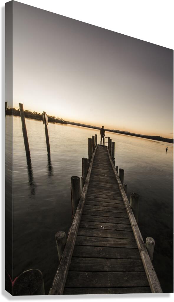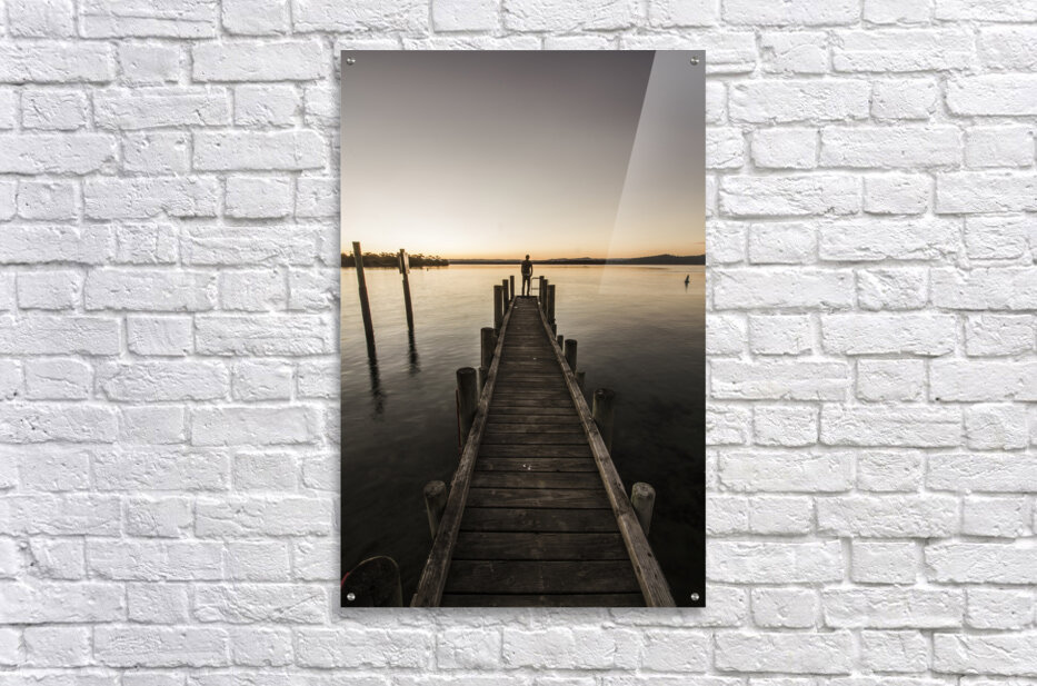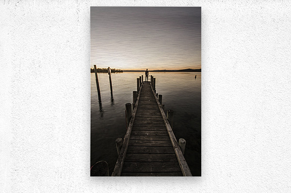 Distant lifestyle photograph of a male silhouette standing on the end of a ocean jetty watching a beautiful sunset seascape. Endings and beginnings