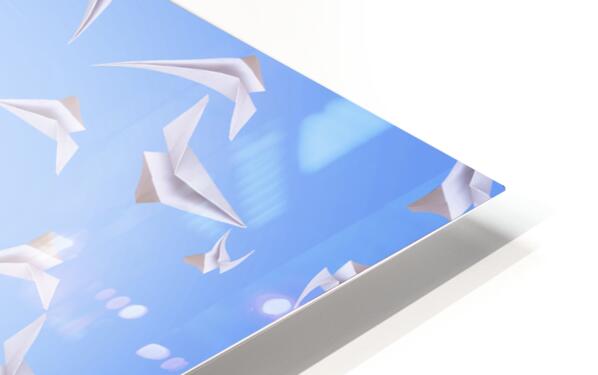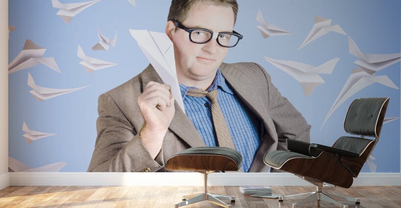 Business man flying paper aircraft in various directions in an international business travel concept