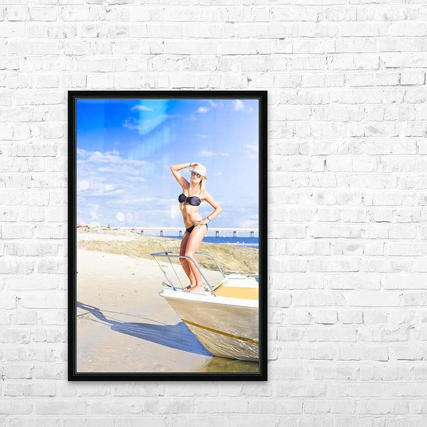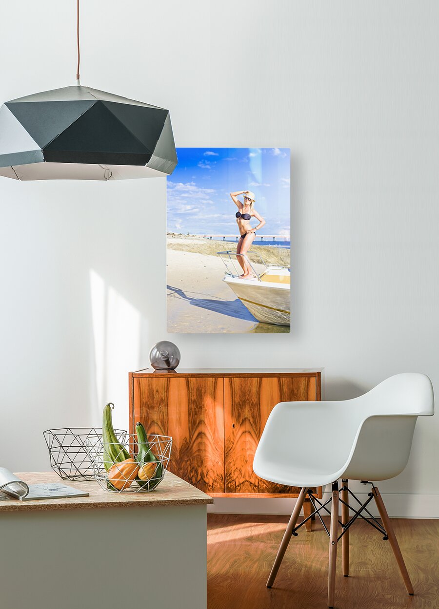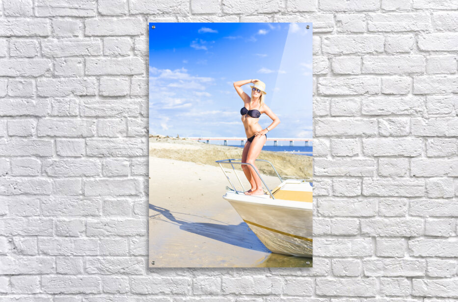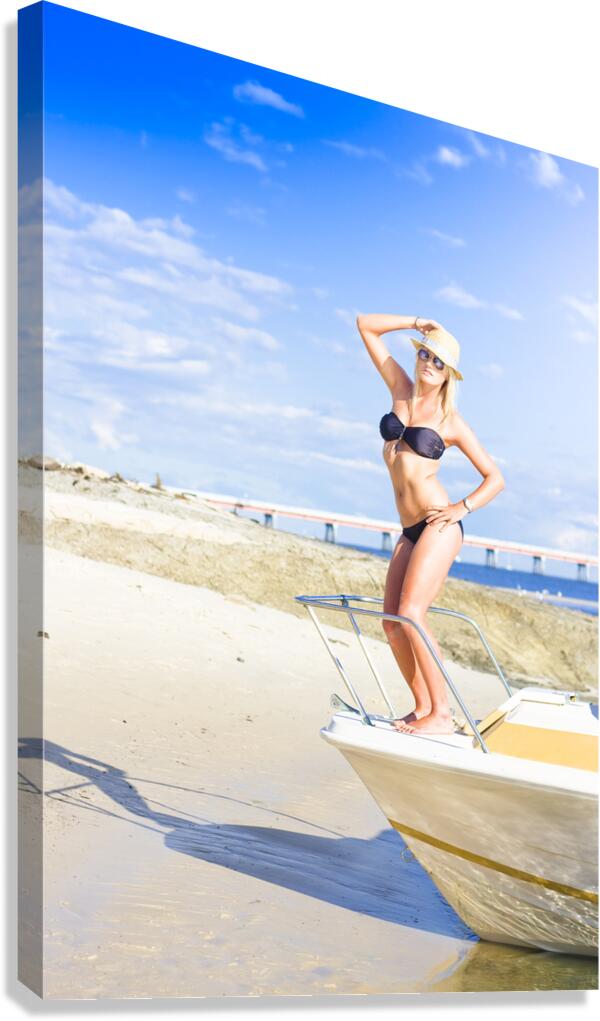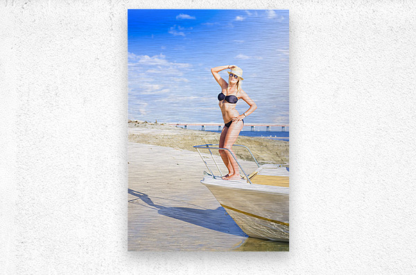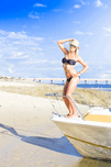 Woman On Lookout For A Perfect Travel Holiday Standing On The End Of A Speedboat At An Idyllic Beach Tourism Destination Blue Sky Background With Copy...[+]
