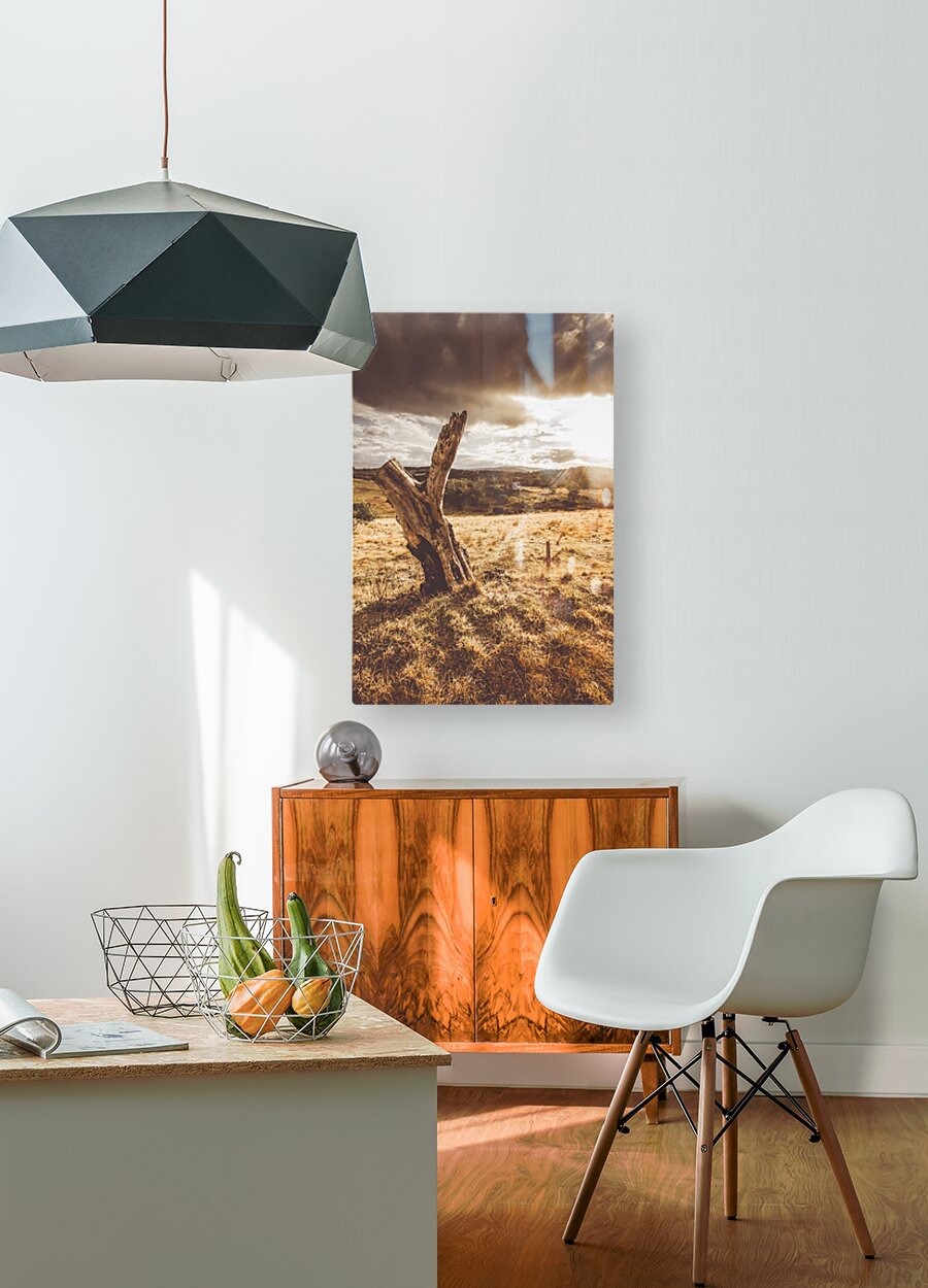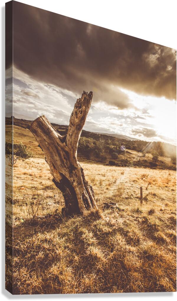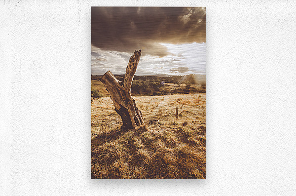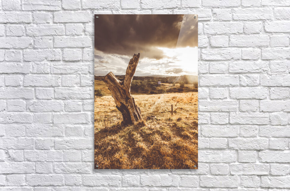 Arid Tasmania bush landscape of a dead tree stump on a sunny dawn field. Cranbrook Tasmania Australia