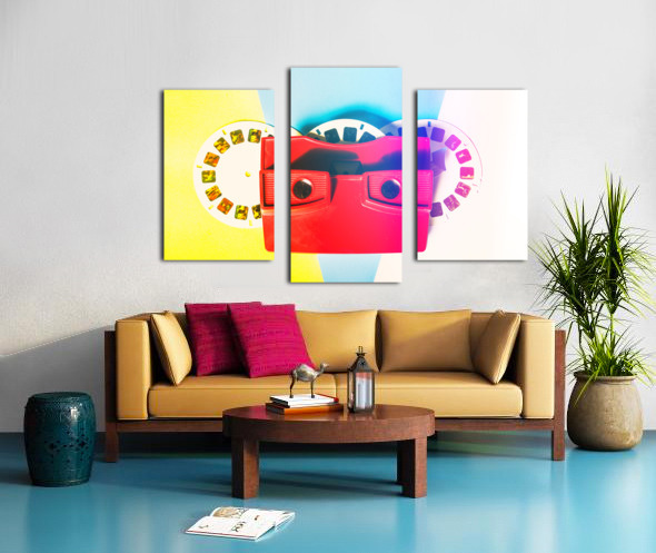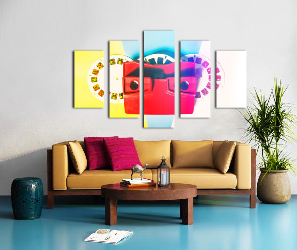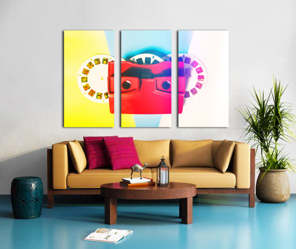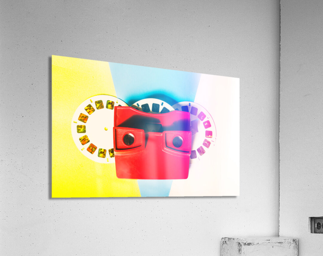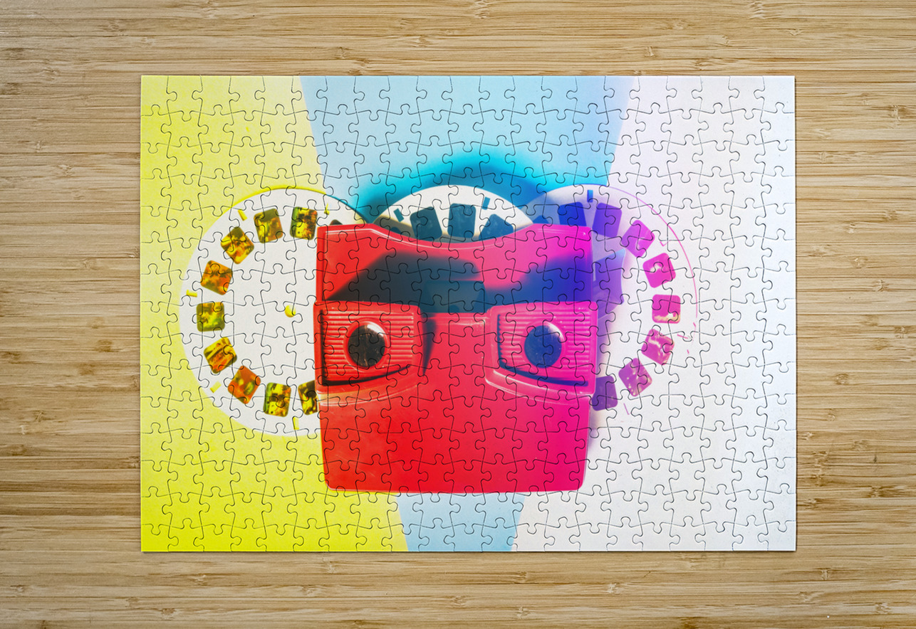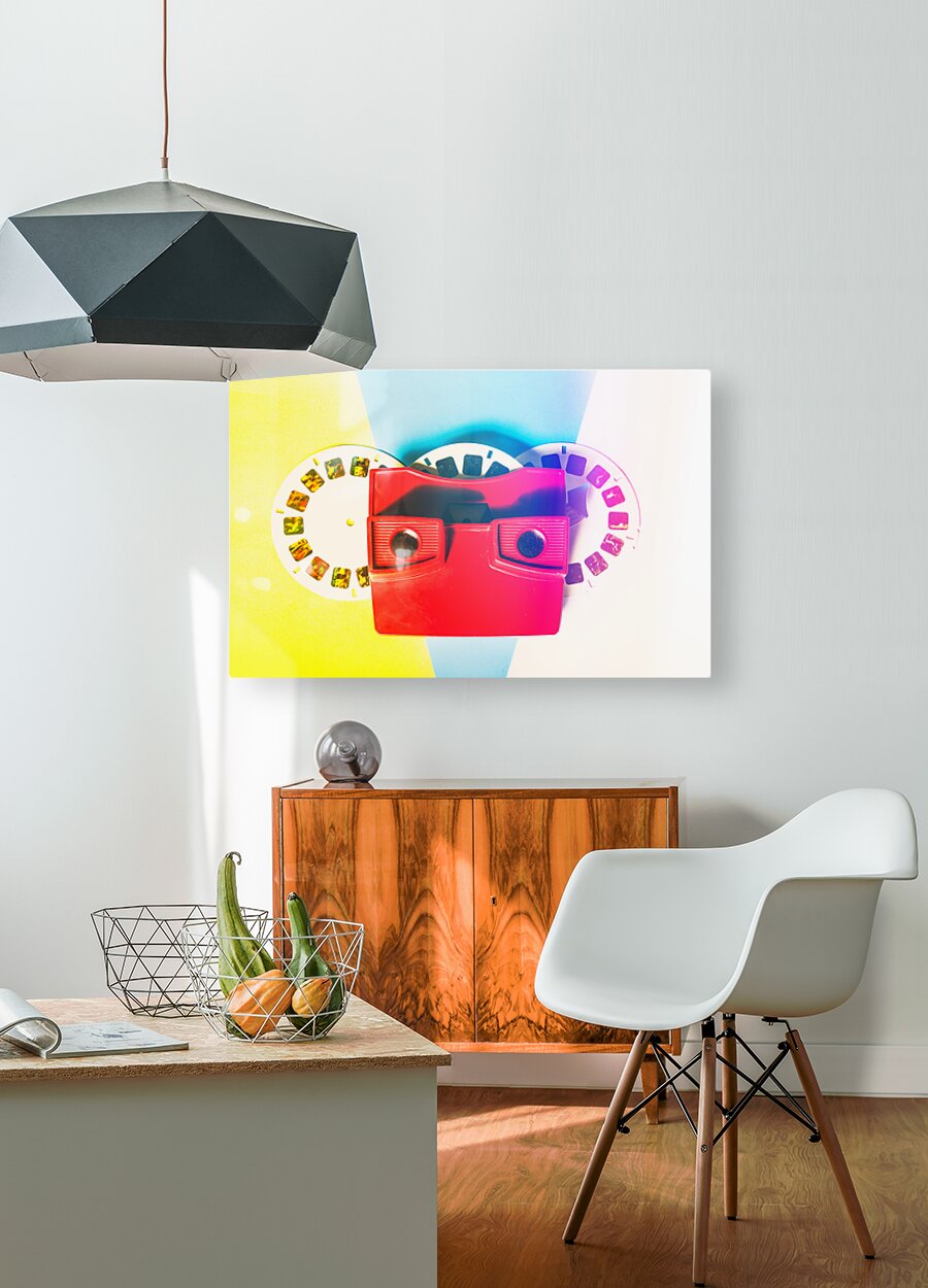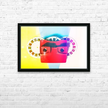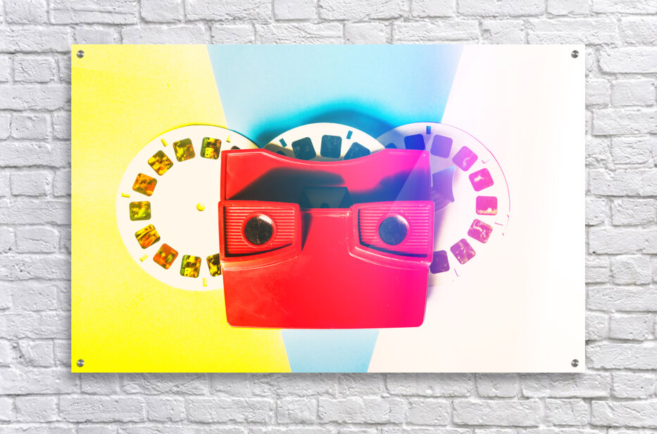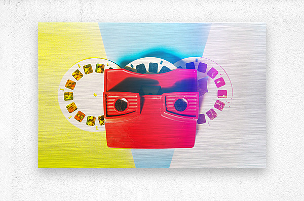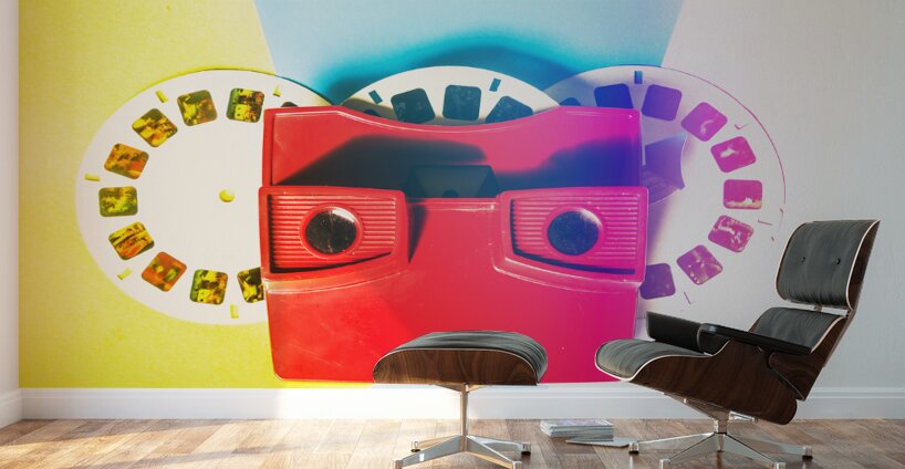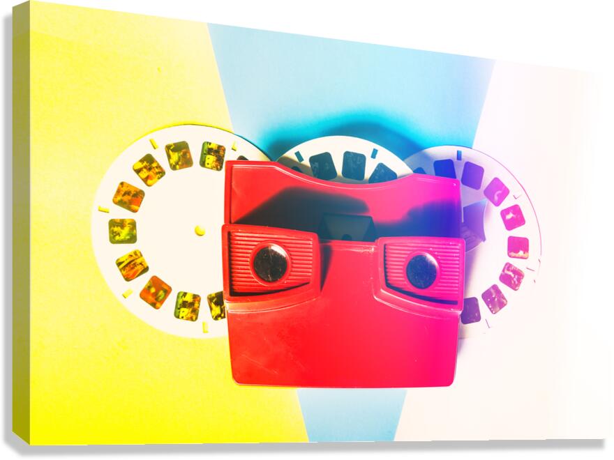 Flared pop art still on an antique slide viewer seen in a colorful faded flashback. Retro reel