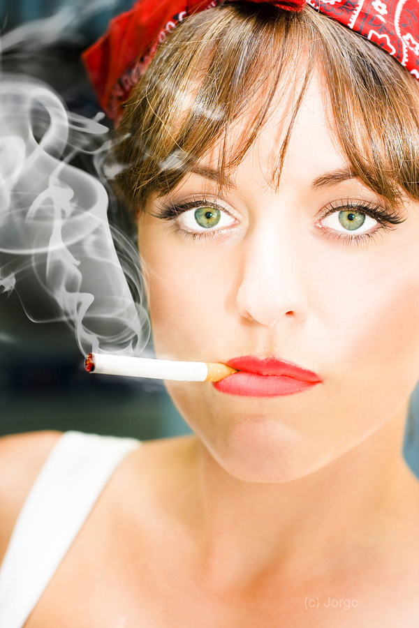 Smoke And Toxic Fumes Smolder From The End Of A Cigarette Butt Sitting In The Mouth Of A Unhappy Woman Smoker Staring With A Miserable And Sad Express...[+]