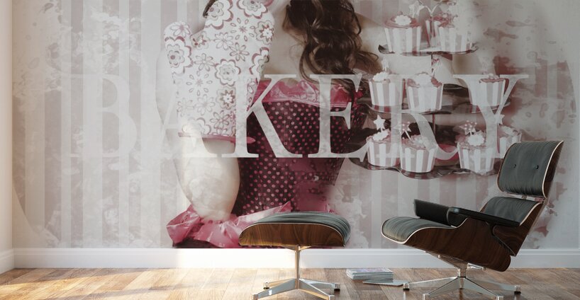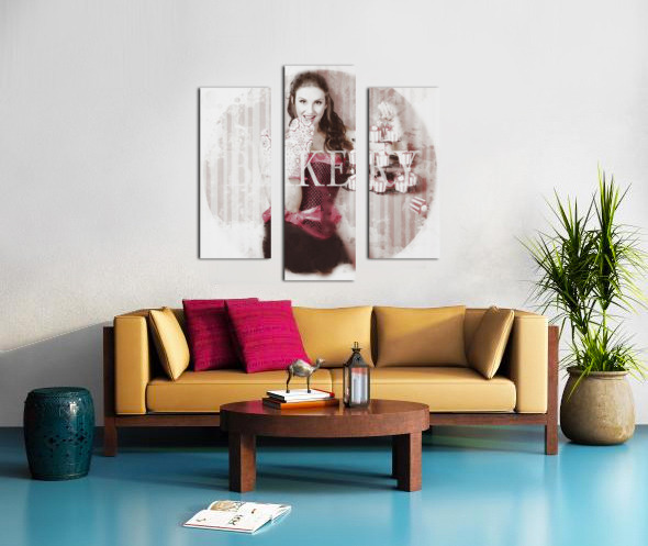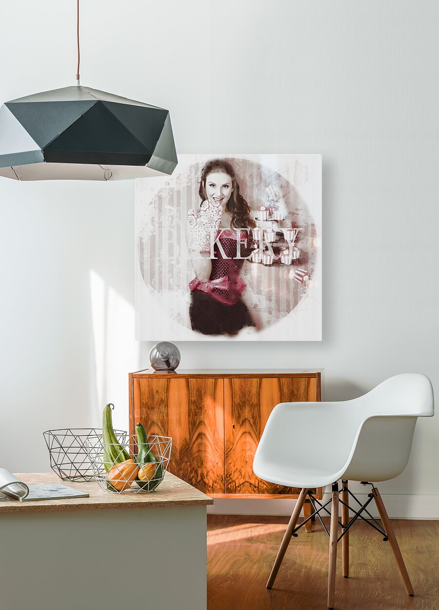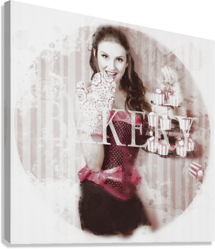 Get this artwork "Pinup girl cooking up surprise treat in bakery" in a framed print.
