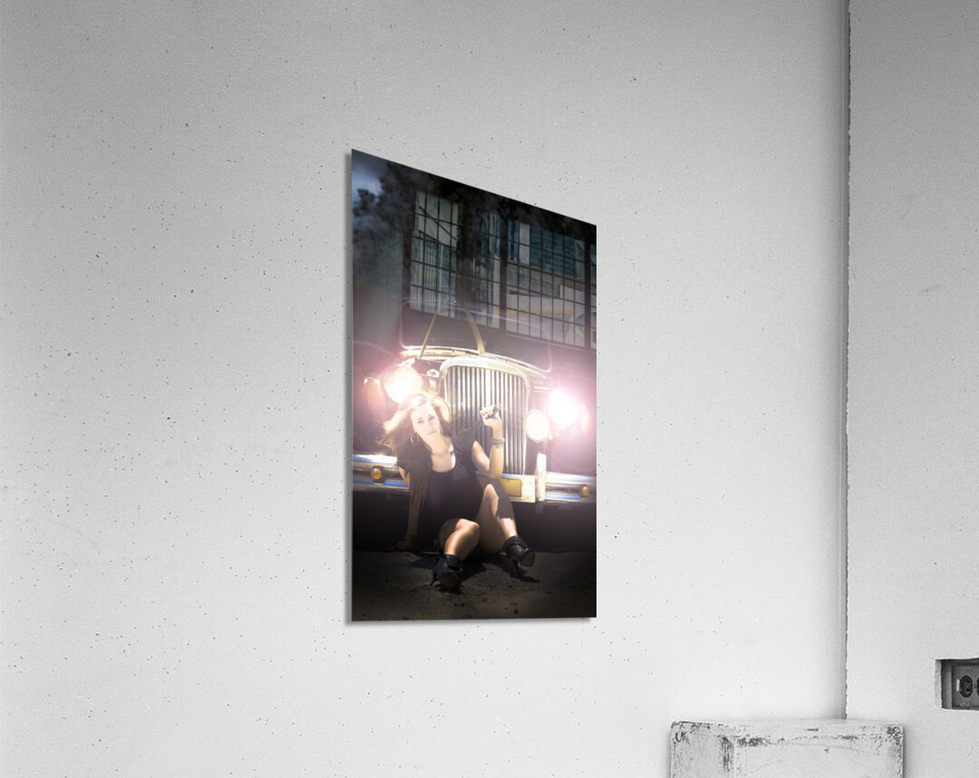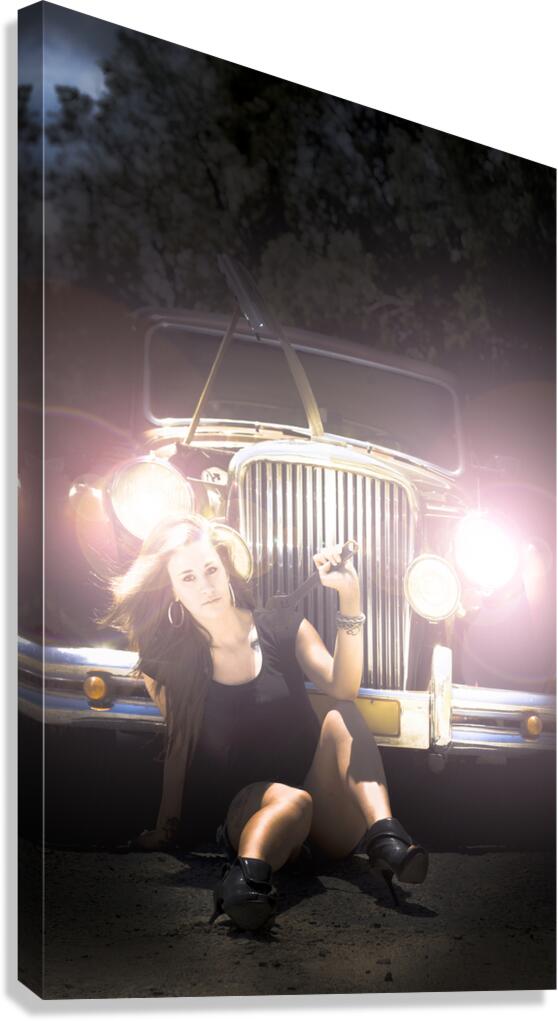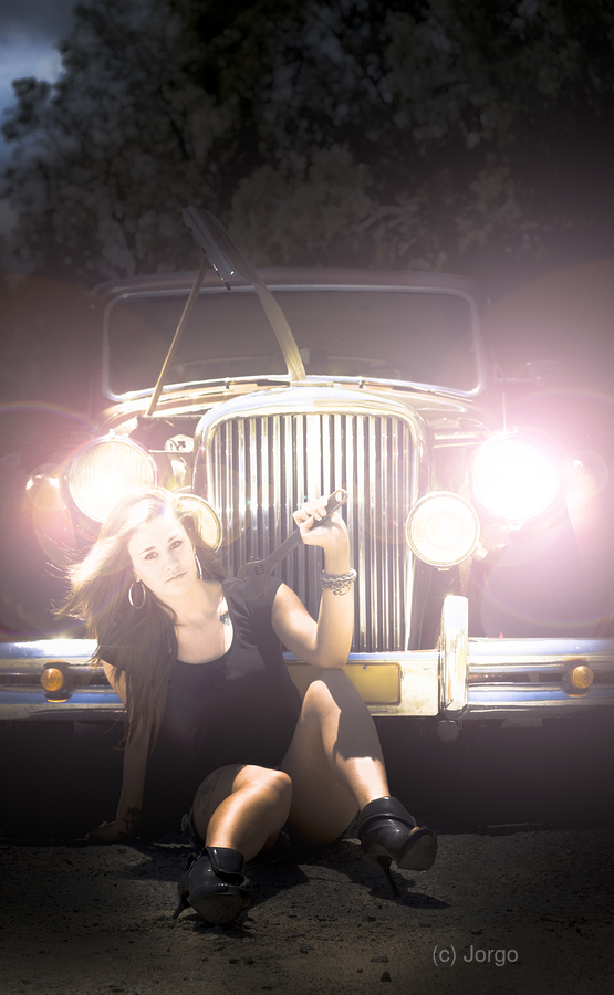Woman Mechanic Sitting In Front Of Broken Down Classic Car