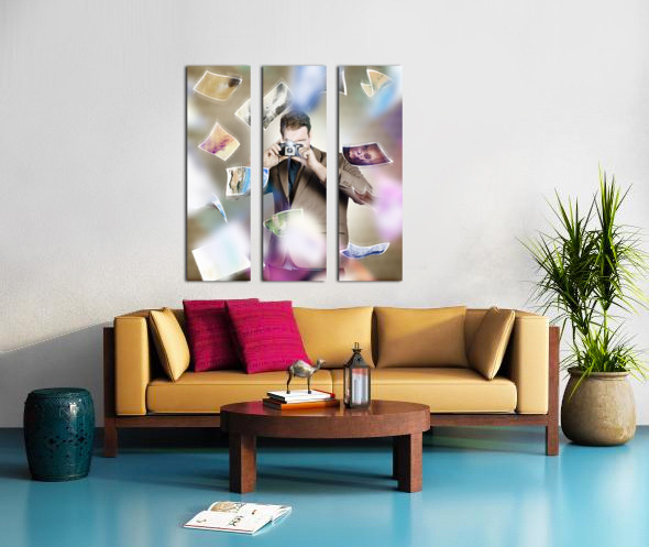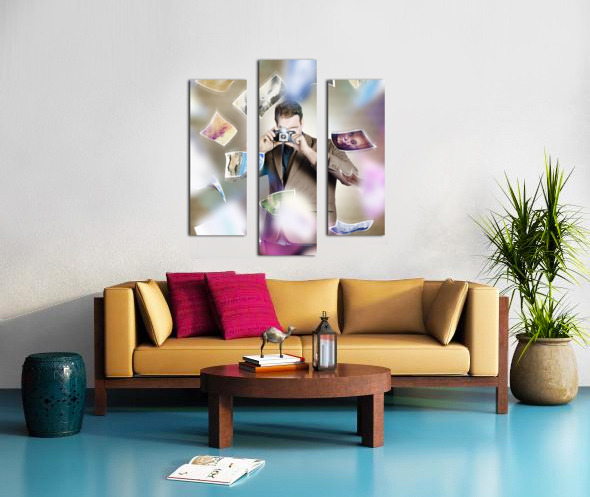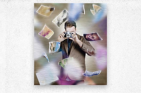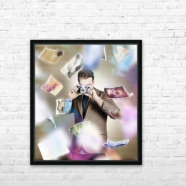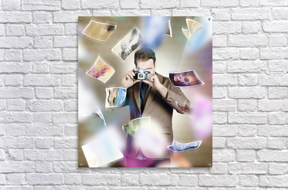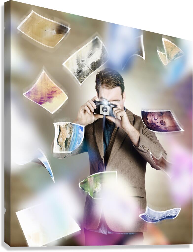 Artistic portrait of a photographer man taking photo with retro camera amidst a movement of falling pictures. Photography competition concept