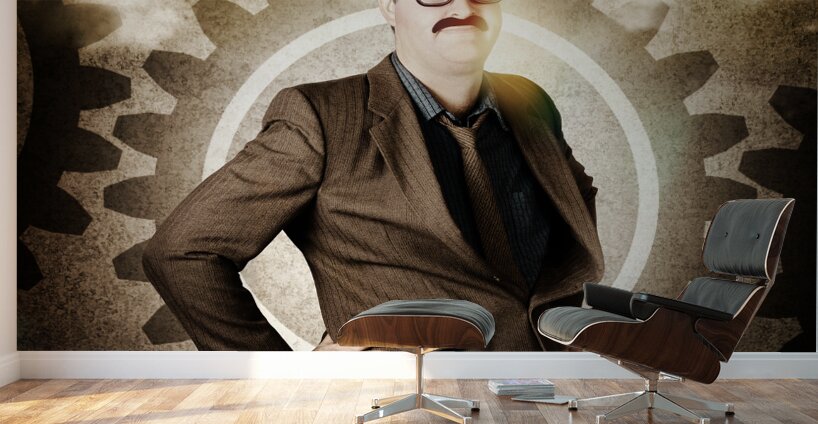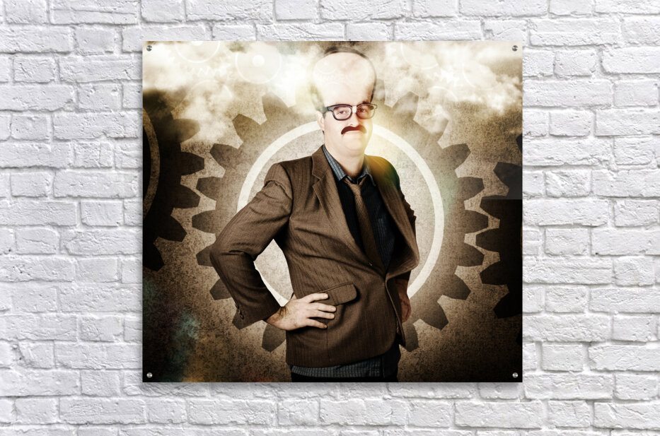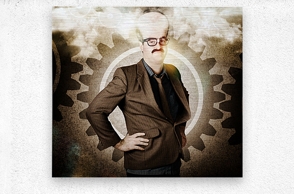 Thinking businessman with big brain standing in clouds of thought and innovation. Mechanical engineer