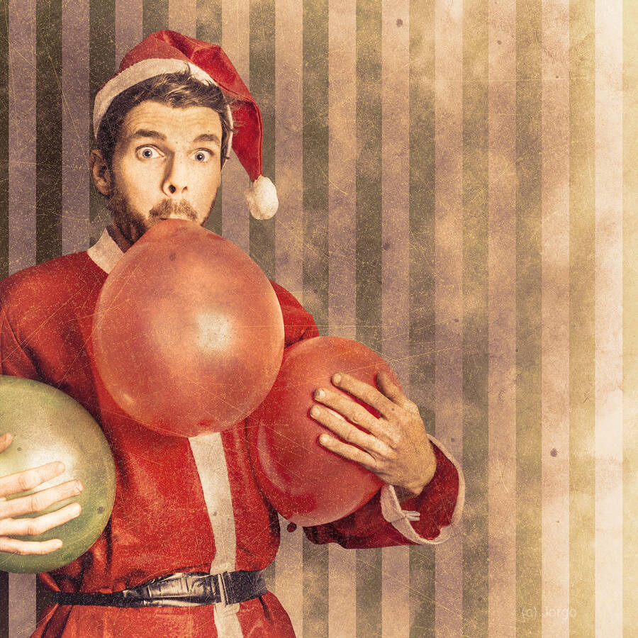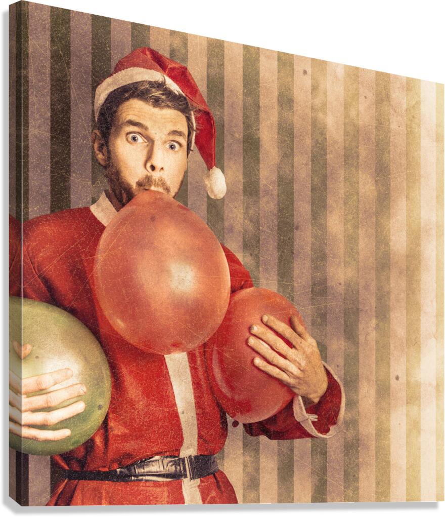 Vintage textured christmas card concept on a santa man blowing up party balloon in preparation for a happy holiday event. Xmas copyspace celebrations