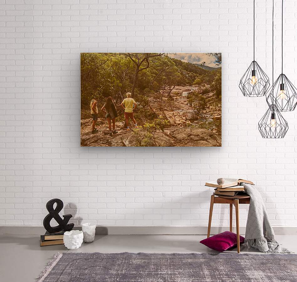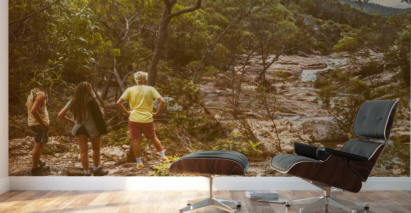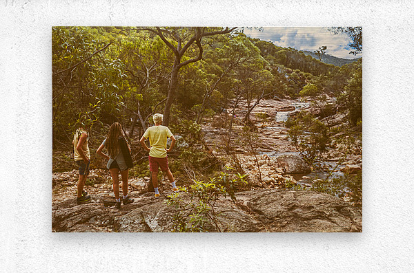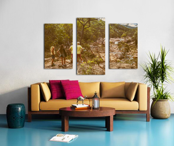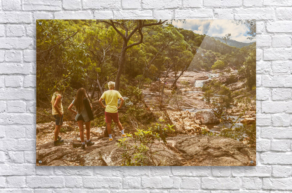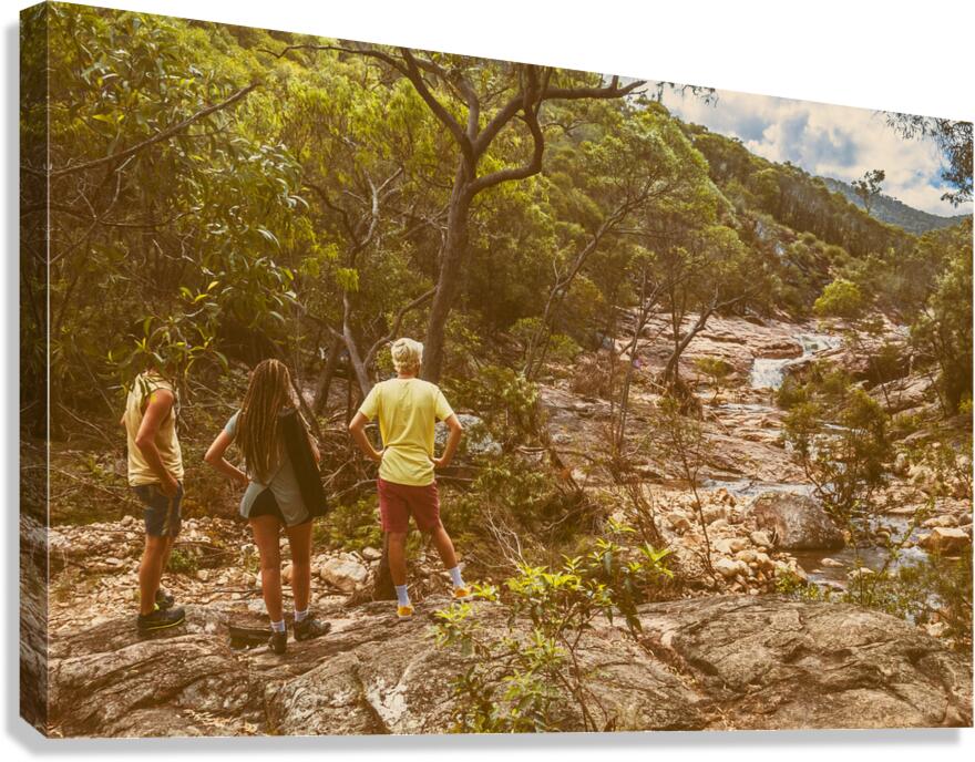 Travelling lifestyle scene on a group of 3 tourists admiring a splendid waterfall outlook. Mount Walsh Waterfall Creek Utopia Falls Biggenden Queensland Australia